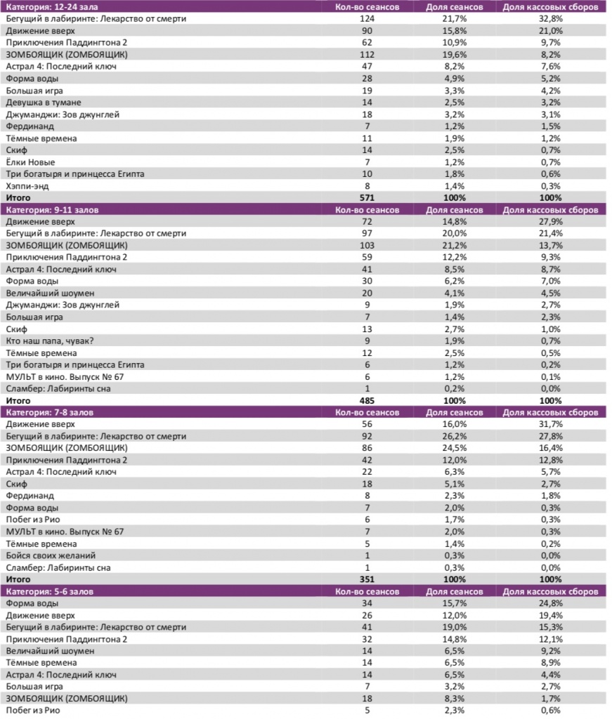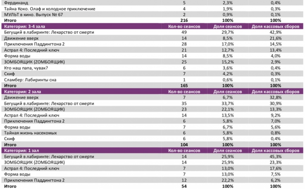 Среди семи лучших кинотеатров страны с разным количеством залов «Движение вверх» сохранило лидерство в трех кинотеатрах.