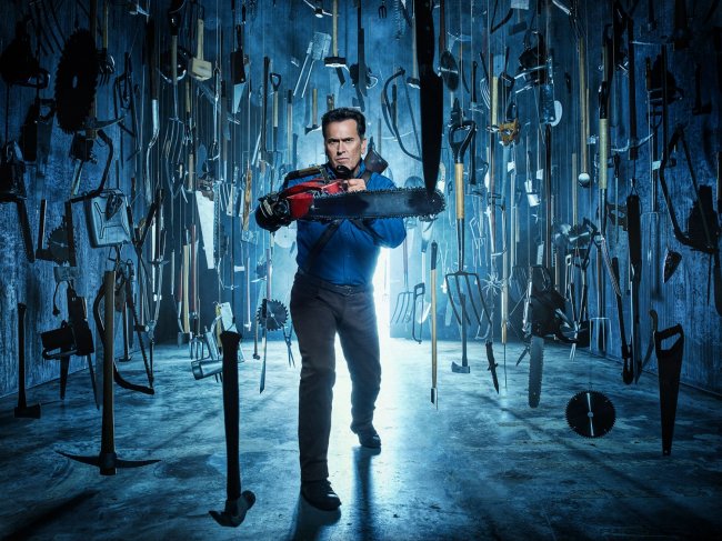 Брюс Кэмпбелл и Люси Лоулесс на промофото к третьему сезону «Эша против Зловещих мертвецов». Возвращение разудалой мясорубки ожидается на канале Starz 25 февраля.