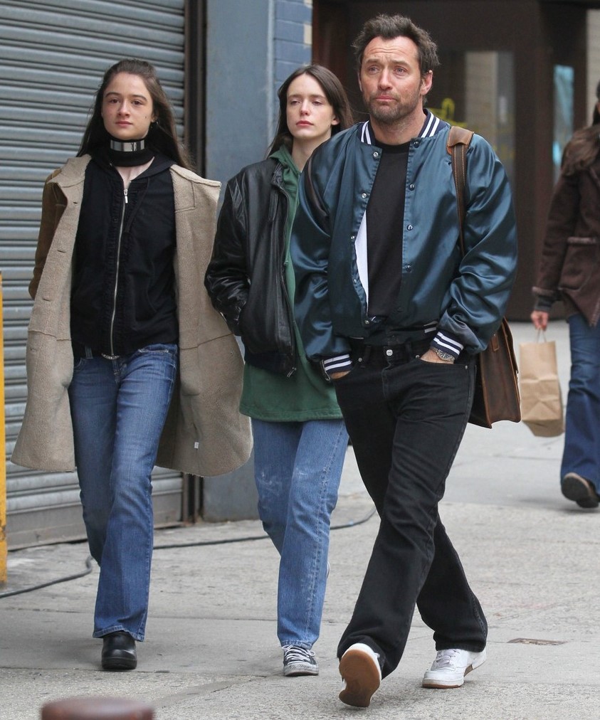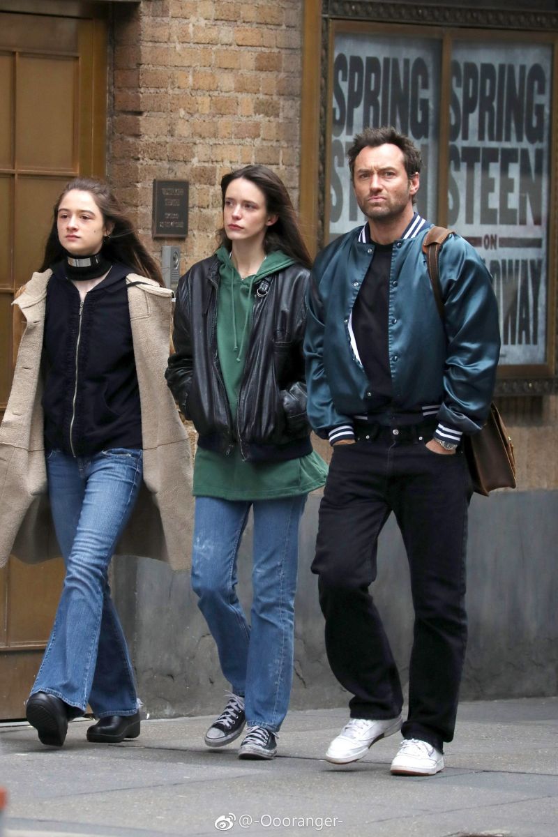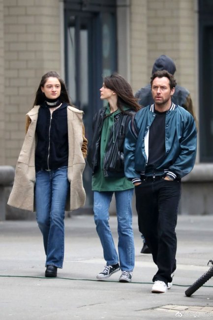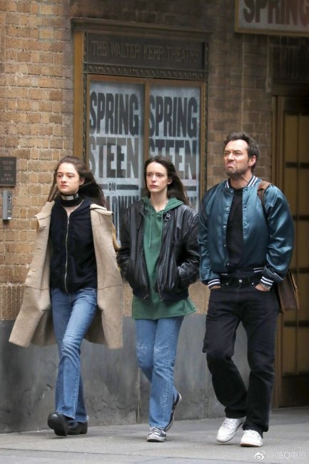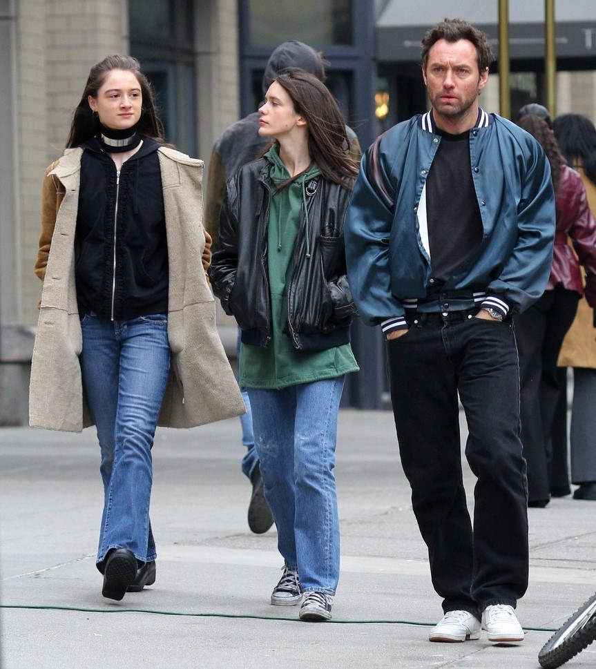 Джуд Лоу, Рэффи Кэссиди («Убийство священного оленя») и Стэйси Мартин («Нимфоманка») на свежих фото со съёмок музыкальной драмы «Голос света», проходящих в Нью-Йорке. Главную роль в картине исполняет Натали Портман.