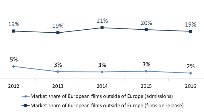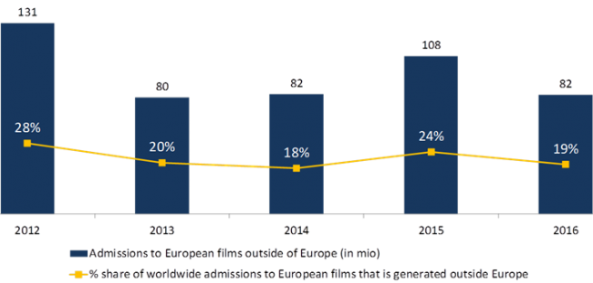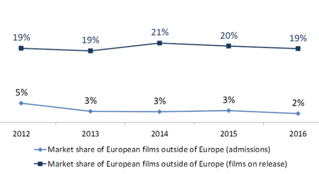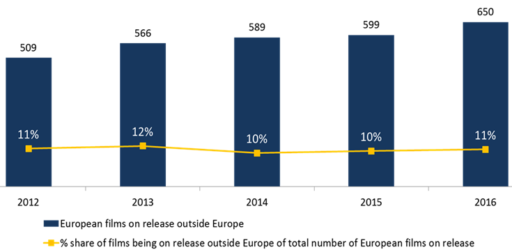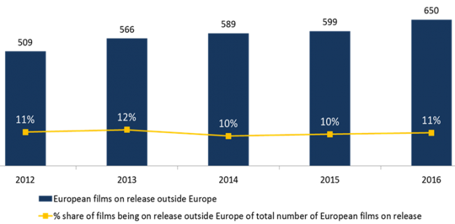 В 2016 году за пределами Европы в кинотеатральный прокат были выпущены 650 европейских фильмов, что на 8,5% превышает показатель 2015 года. Это самое большое количество европейских фильмов, выпущенных на зарубежные рынки за последние пять лет.