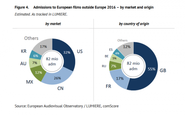 Доля рынка европейских фильмов на 12 территориях оставалась стабильной на протяжении пяти лет. США остаются крупнейшим зарубежным рынком для европейских фильмов, на который приходится 32% проданных билетов (на европейские ленты за пределами Европы). Несмотря на очень ограниченное количество европейских релизов, Китай стал вторым по величине рынком для проката европейского кино – в 2016 году на него было продано 18,6 млн билетов, что составляет 23% от общего числа купленных билетов. Далее следуют Мексика (12%), Австралия (7%) и Южная Корея (6%).