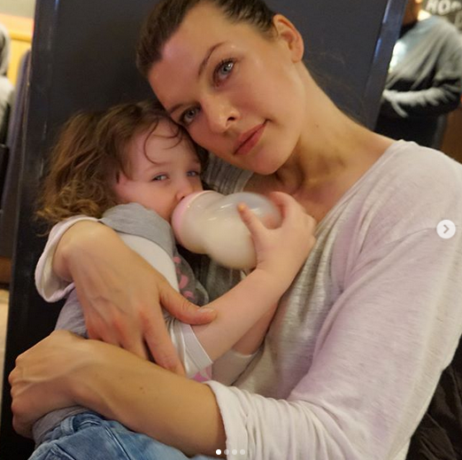 На новой фотографии знаменитость держит свою дочь Дашиэл Идэн на руках, пока та что-то пьет из бутылочки. В публикации Мила написала: "Жирная еда и арбузные маргариты для взрослых, аркады и боулинги для детей, это прекрасное дождливое воскресенье".