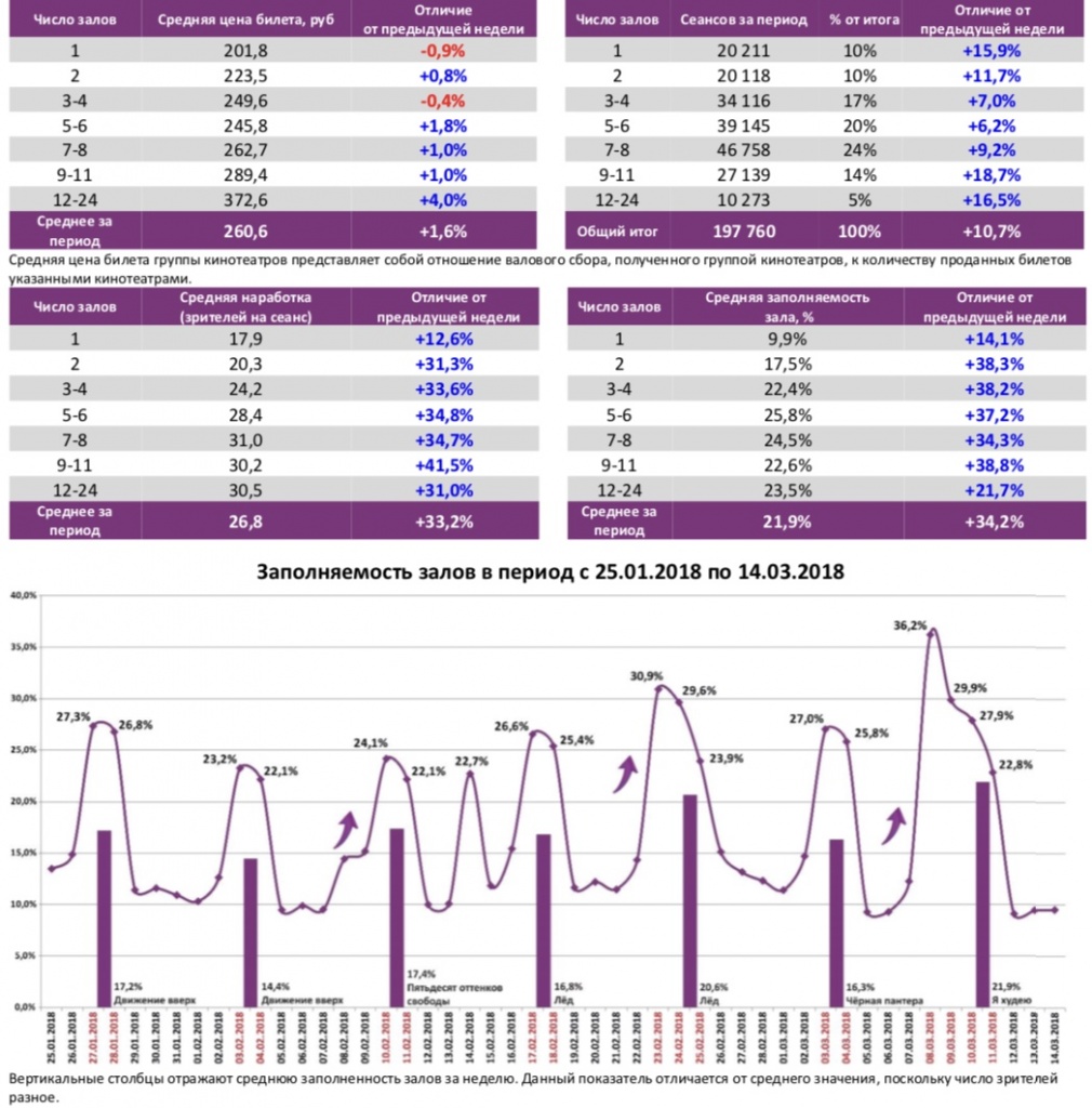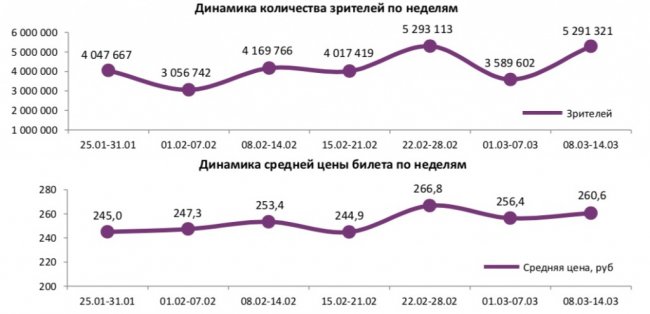 Как показывает индустриальная статистика с 8 по 14 марта (неделя №10), за неделю с четырьмя выходными днями (начиная с 8 марта) в российские кинотеатры пришло 5,3 млн зрителей, ровно столько же было на позапрошлой неделе с тремя праздничными днями, включая 23 февраля. Каждый четвертый билет пришелся на новинку-лидера – российскую комедию «Я худею».