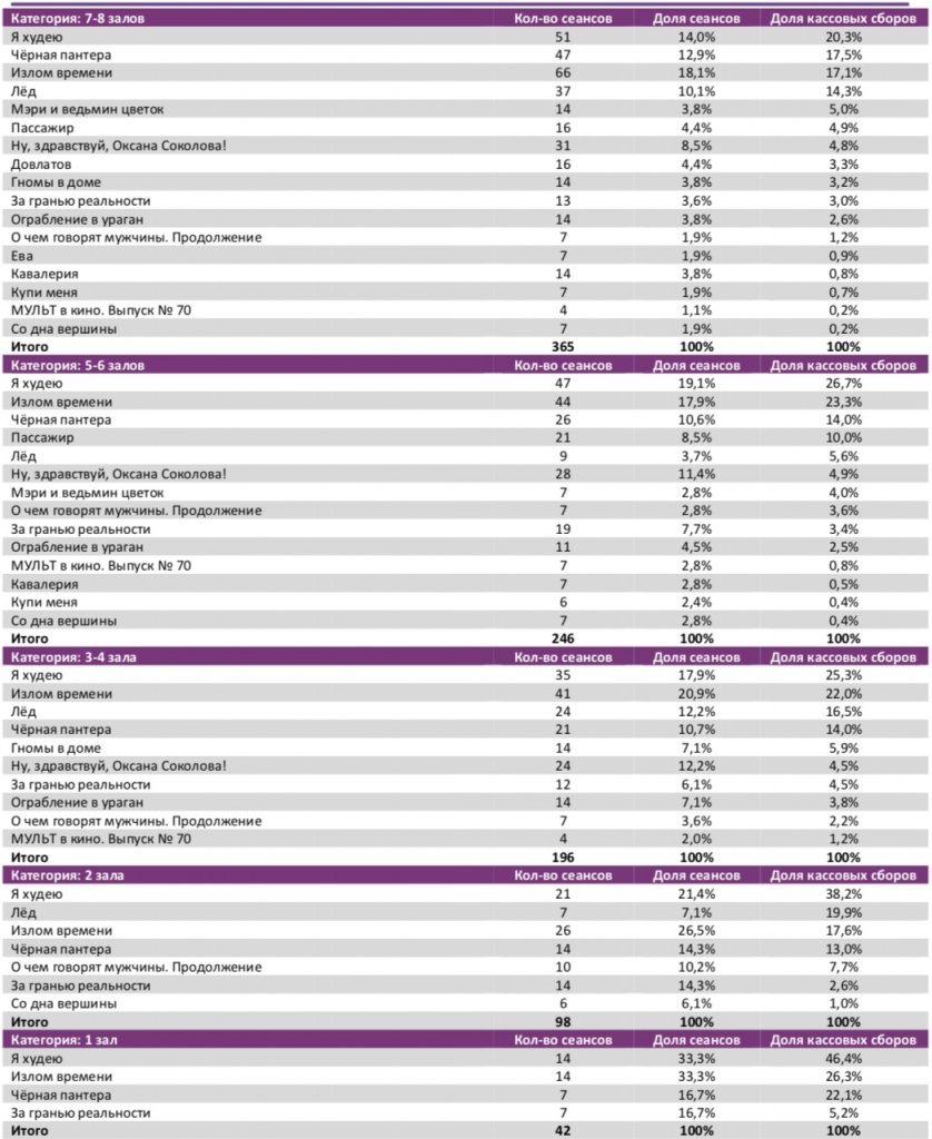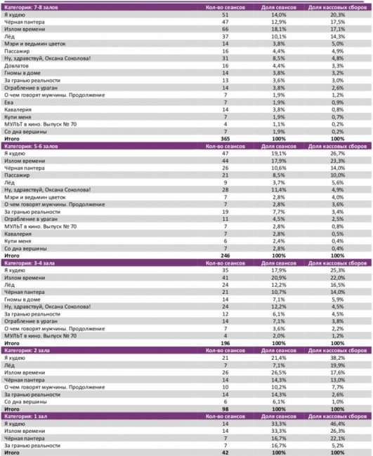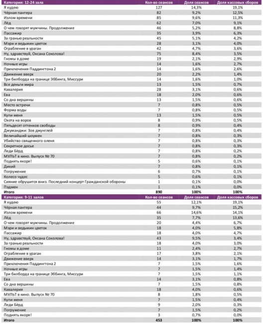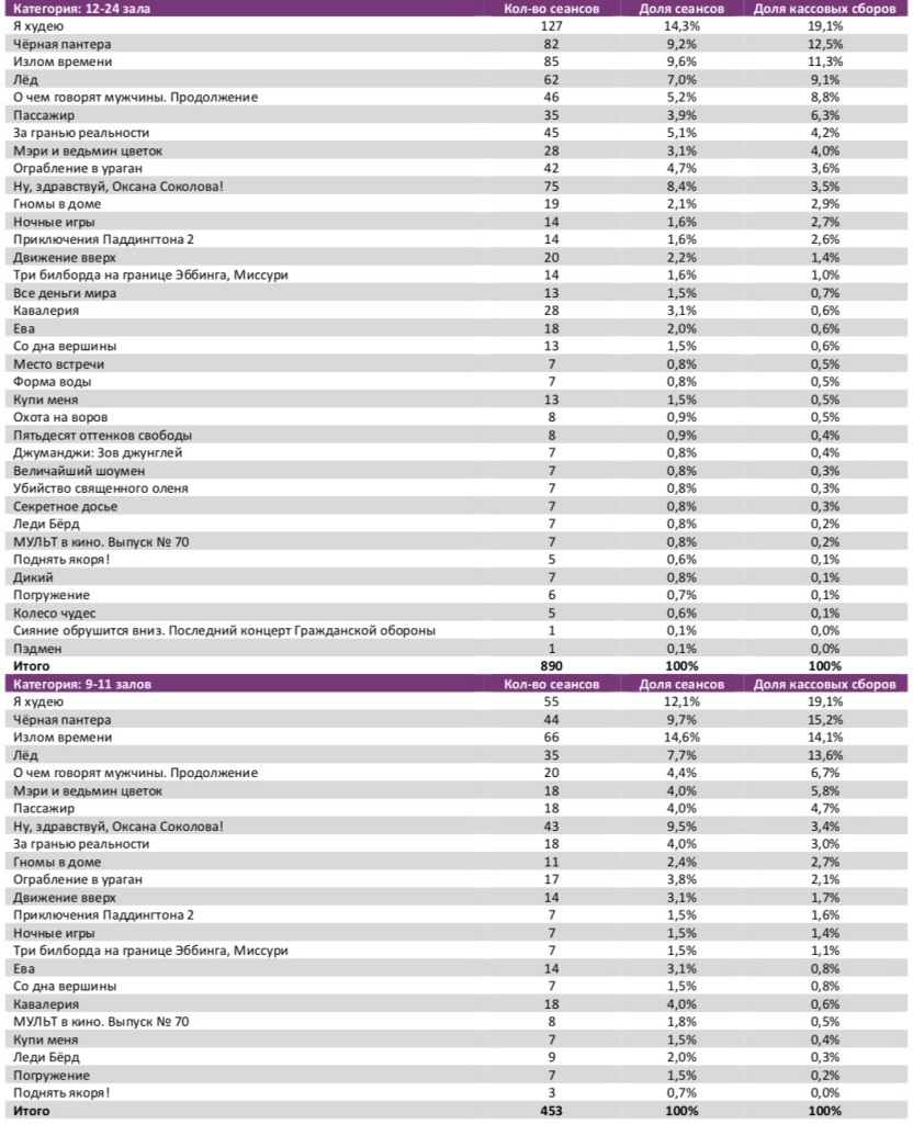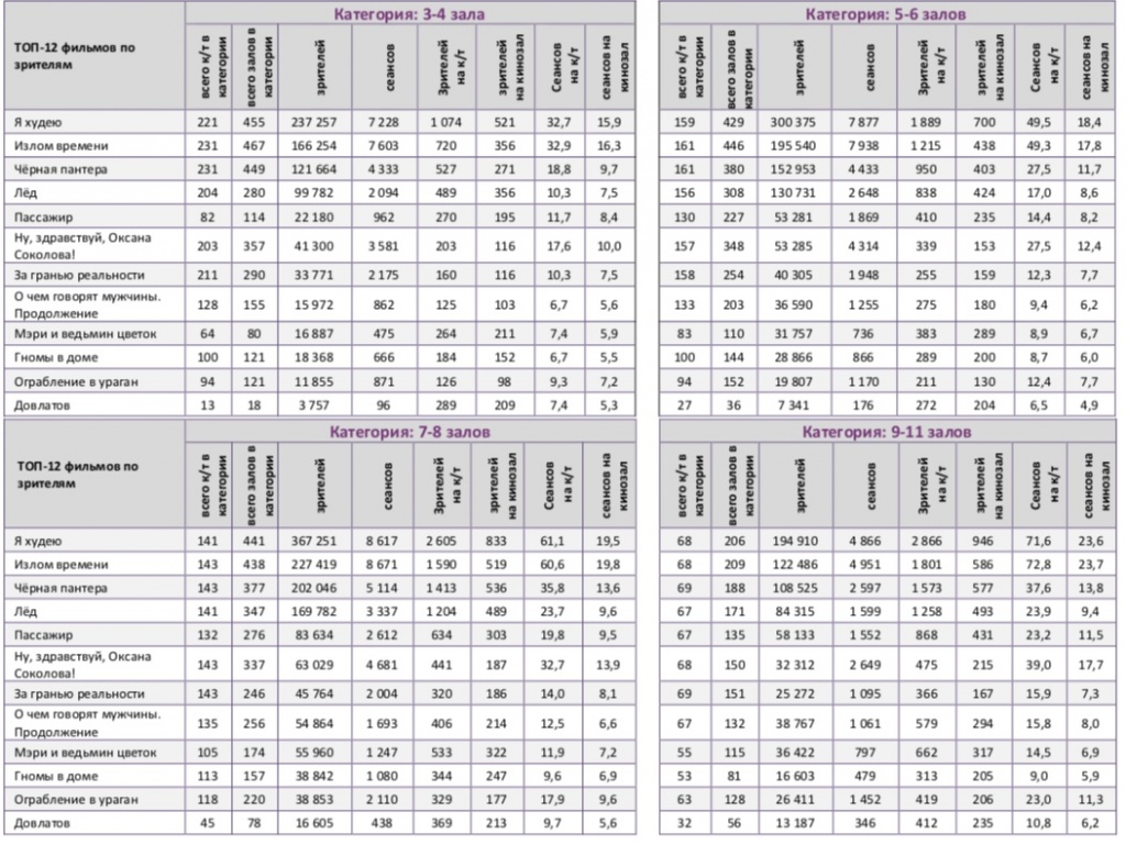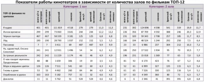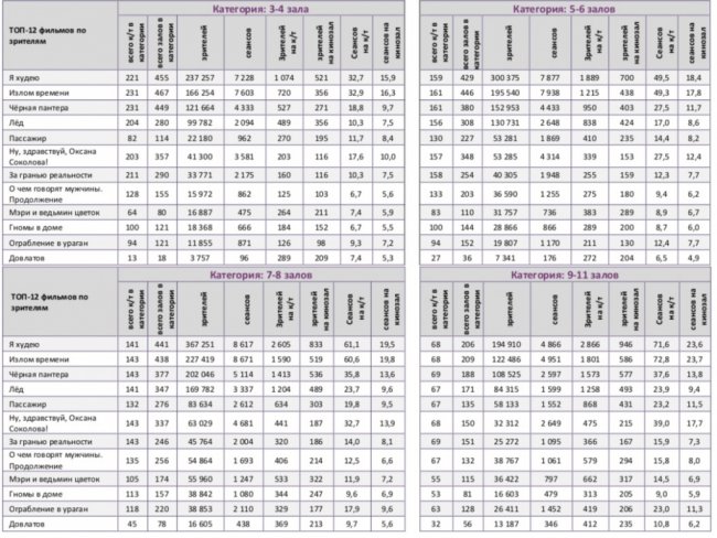 Спортивный мюзикл «Лёд» увеличил общий бокс-офис до 1,4 млрд рублей (5,8 млн зрителей), потеряв на четвертой неделе проката лишь 3% проданных билетов, а по сборам продемонстрировав прирост на 4%. В ТОП-12 вторую неделю подряд не менее половины российских фильмов. Лидера «Я худею» за четыре дня посмотрело 1,4 млн зрителей.