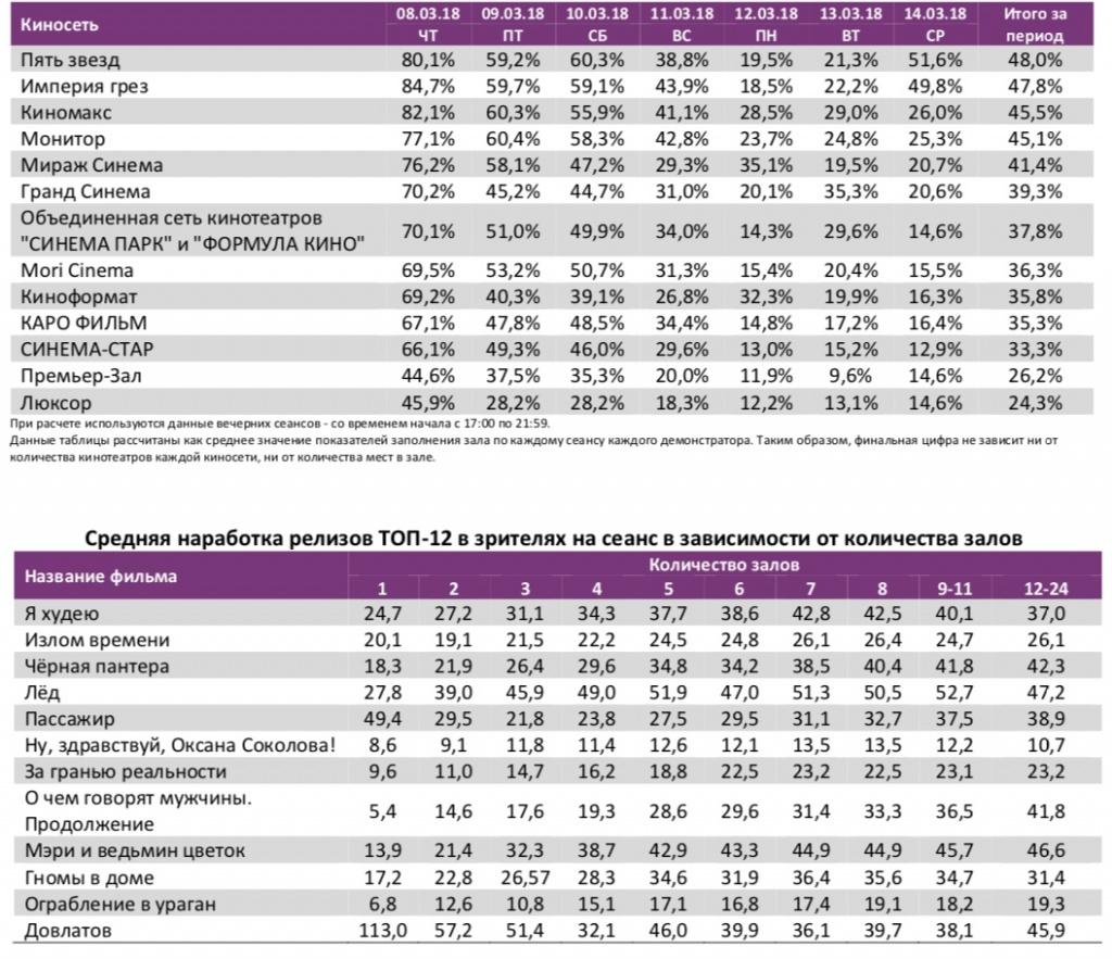 Заполняемость кинозалов крупнейших киносетей на сеансах фильма-лидера недели