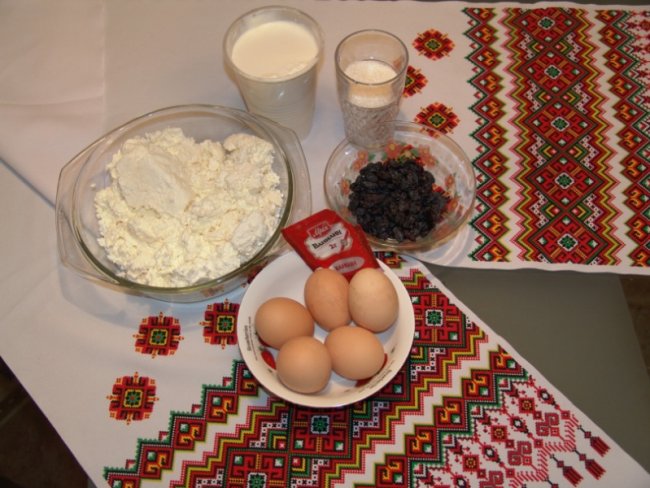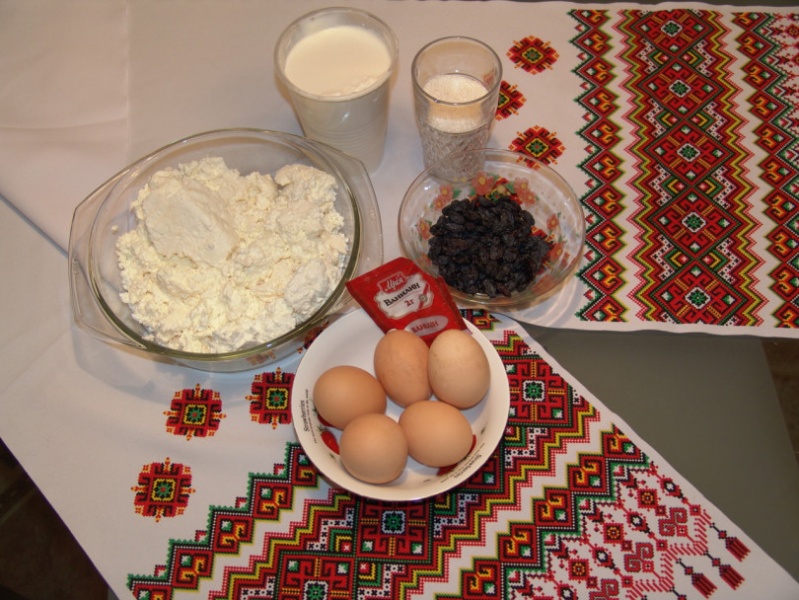 800 г жирного домашнего творога 3-4 ст. ложки сахарного песка 3-6 домашних яиц 50 г изюма пакетик ванильного сахара