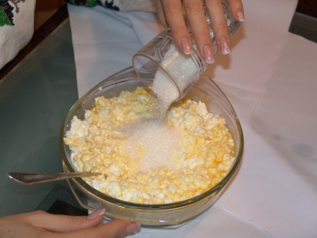 К творогу и яйцам добавляем ванильный сахар и сахарный песок. Тщательно все перемешиваем.