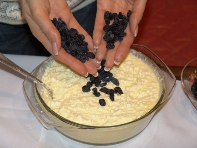К полученной массе добавляем изюм и тщательно все вымешиваем.