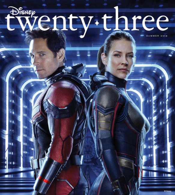 Обложка нового номера журнала Disney twenty-three с участием заглавных персонажей из супергеройского блокбастера Marvel «Человек-муравей и Оса», сыгранных Полом Раддом и Эванджелин Лилли.