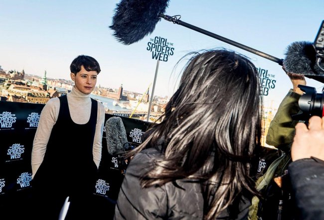 Участники актёрского состава триллера «Девушка, которая застряла в паутине» и режиссёр Феде Альварез («Не дыши», «Зловещие мертвецы. Чёрная книга») на фотоколле в Стокгольме. Образ главной героини, Лисбет Саландер, воплощает Клэр Фой («Корона», «Волчий зал»).