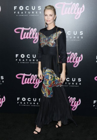 Терон стала настоящим украшением вечера. На мероприятие, посвященное премьере "Талли" Шарлиз пришла в длинном черном платье Christian Dior с ярким принтом в виде огромных бабочек. Образ звезда дополнила черными босоножками и сумочкой на цепи в тон наряду.