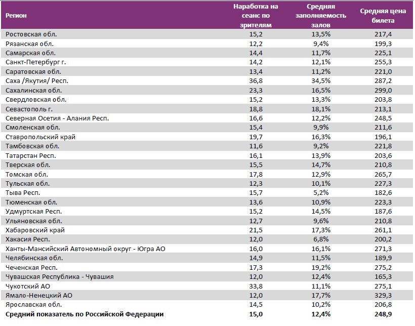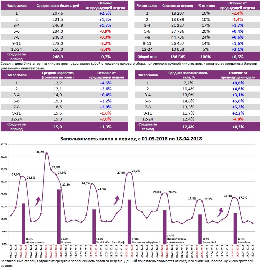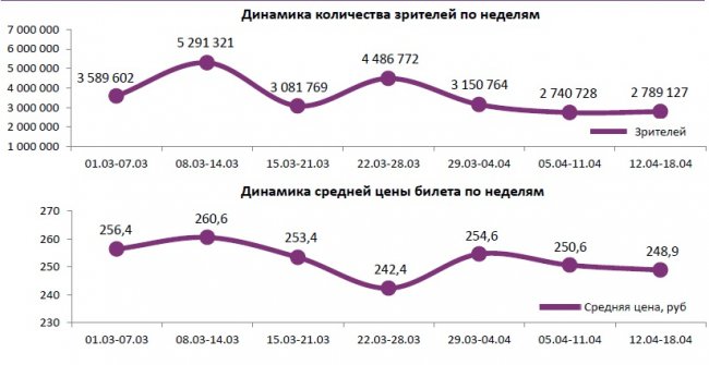 Как показывает индустриальная статистика с 12 по 18 апреля (неделя №15), посещаемость российских кинотеатров осталась на уровне прошлой недели. «Гоголь. Вий» за две недели преодолел рубеж в 1,5 млн проданных билетов. А «Я худею» приблизился к отметке в 2,5 млн проданных билетов. Лучшая наработка на сеанс у российского регионального проекта «Республика Z». Наработка на сеанс осталась на уровне прошлой недели - 15 зрителей. Заполняемость в выходные дни чуть выросла, но уменьшилась в будни.