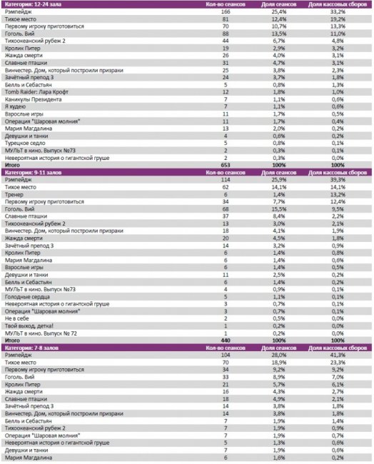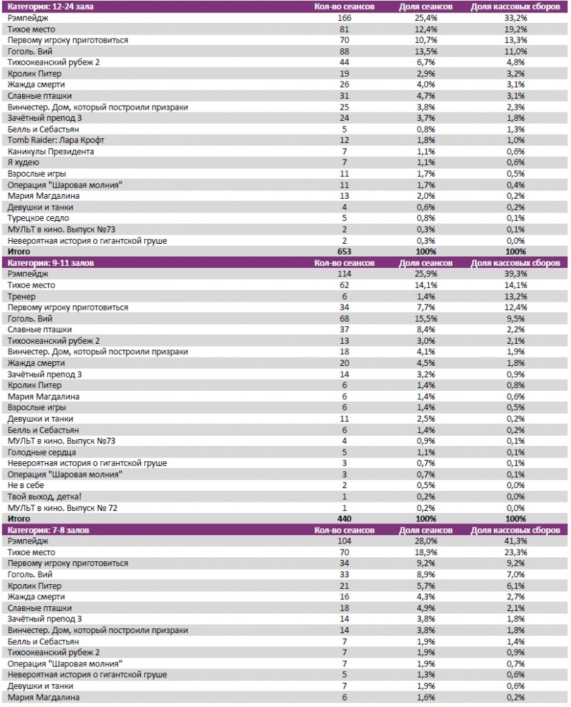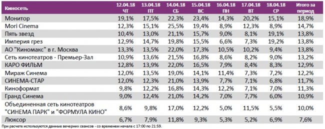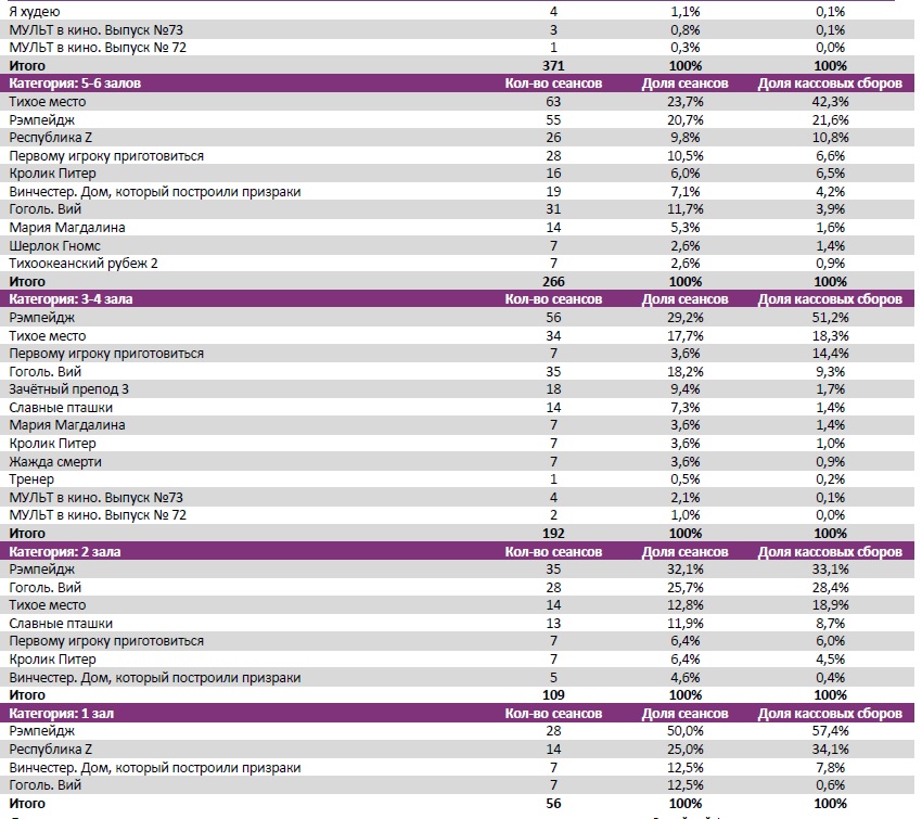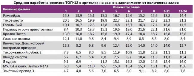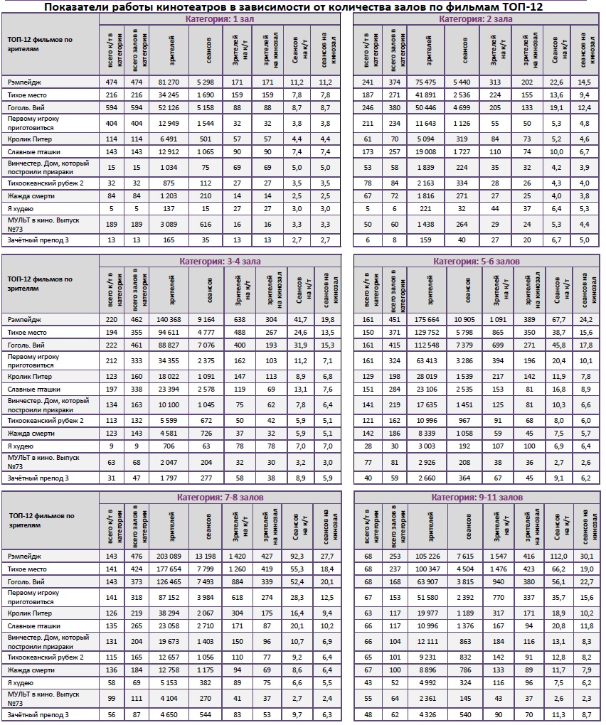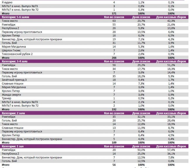 Как показывает индустриальная статистика с 12 по 18 апреля (неделя №15), посещаемость российских кинотеатров осталась на уровне прошлой недели. «Гоголь. Вий» за две недели преодолел рубеж в 1,5 млн проданных билетов. А «Я худею» приблизился к отметке в 2,5 млн проданных билетов. Лучшая наработка на сеанс у российского регионального проекта «Республика Z». Наработка на сеанс осталась на уровне прошлой недели - 15 зрителей. Заполняемость в выходные дни чуть выросла, но уменьшилась в будни. Репертуарное планирование кинотеатров с наибольшей выручкой за период «Рэмпейдж» стал лидером в шести из семи самых успешных кинотеатрах. Заполняемость кинозалов крупнейших киносетей на сеансах фильма-лидера недели Фильм-лидер недели: «Рэмпейдж». Киносеть «Монитор» вернула себе лидерство. «Я худею» продолжает привлекать зрителей в кинотеатрах с 5 залами. Статистика Фонда кино отражает информацию об основных результатах проката, лидерах недели по сборам и наработке на сеанс, показателях работы кинотеатров, эффективности репертуарного планирования, а также о соотношении долей по сборам, зрителям и сеансам в рамках данного периода. Подписывайтесь на наш Телеграм-канал