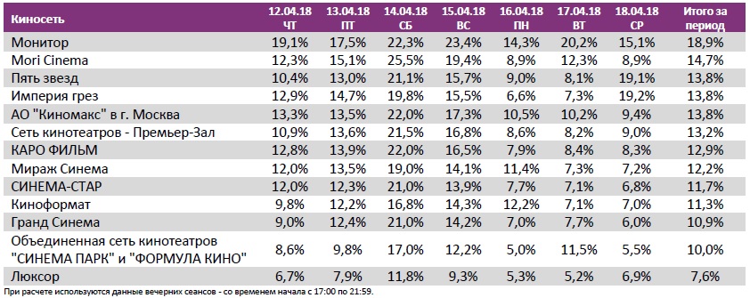 Заполняемость кинозалов крупнейших киносетей на сеансах фильма-лидера недели