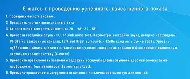 Екатерина Петропавловская уделила внимание подходу WDSSPR к проблеме качественного кинопоказа и отметила, что кино необходимо демонстрировалось именно в том виде, в каком оно было задумано и воплощено создателями. «6 шагов к проведению успешного качественного кинопоказа» от Екатерины Петропавловской включают проверку параметров киноэкрана, синхрона, контроль уровня звука, своевременное обновление оборудования.