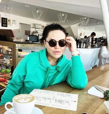 Оксана Байрак сфотографировалась за столиком в кафе, придя туда выпить чашечку кофе. Звезда ТВ не стала снимать сонцезащитных очков, вероятно, скрывая не накрашенные глаза.