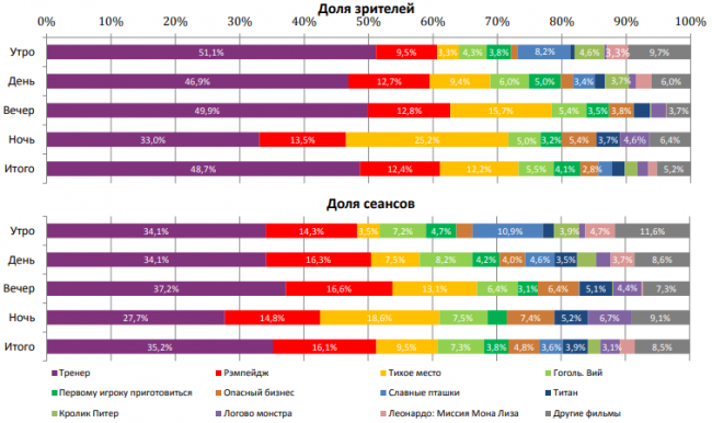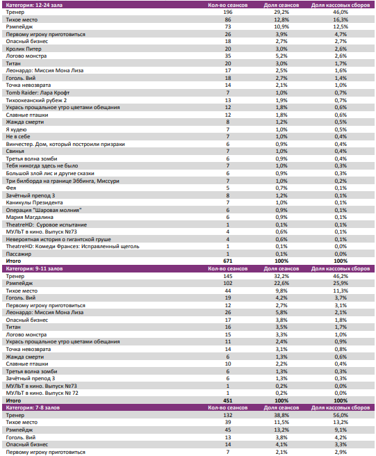 «Тренер» в пяти самых успешных кинотеатрах страны с количеством залов больше трех показал долю сборов 36-56%. В двух самых успешных одно- и двухзальниках – 62-69%.