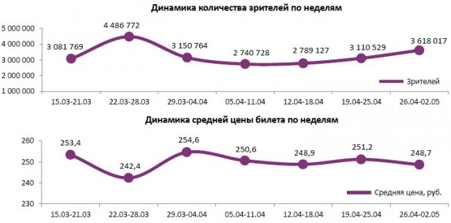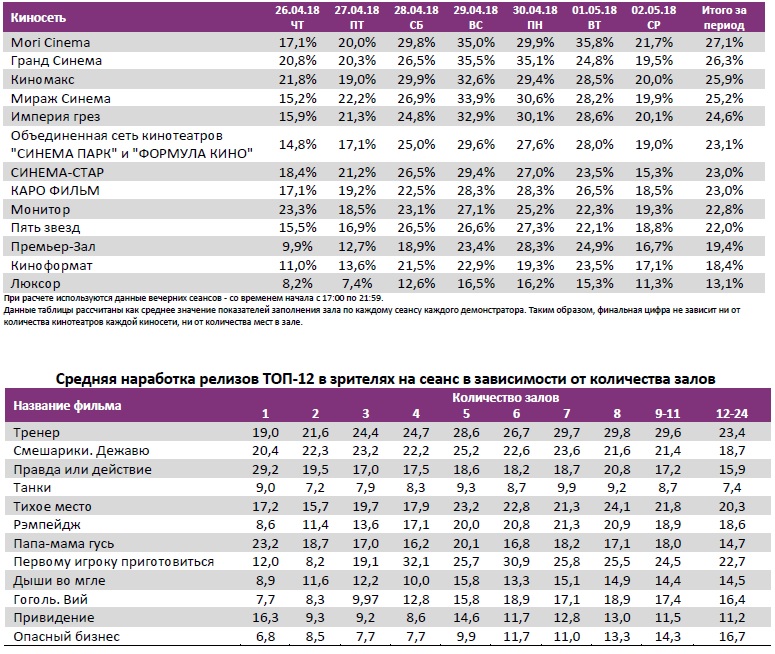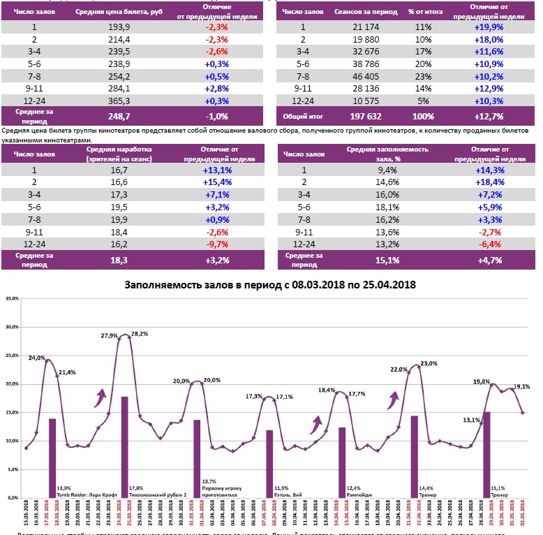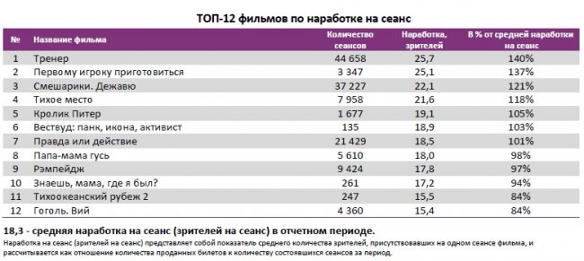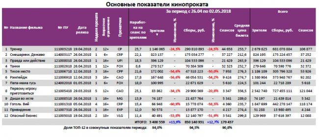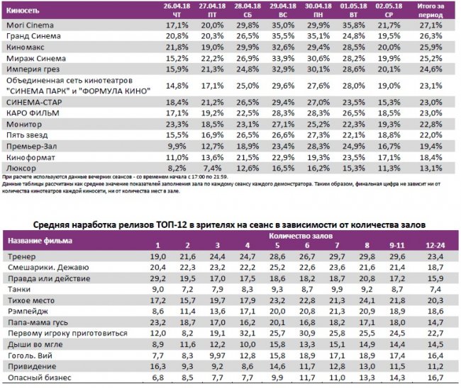 Как показывает индустриальная статистика с 26 апреля по 2 мая (неделя №17), благодаря майским праздникам посещаемость российских кинотеатров относительно показателей прошлой недели выросла до 3,6 млн зрителей. Для сравнения, в непраздничный период 22-28 марта было продано больше билетов – 4,5 млн. Тогда на экраны вышли «Тихоокеанский рубеж 2» и «Кролик Питер». Российские проекты «Тренер», «Смешарики. Дежавю», «Танки» и «Гоголь. Вий» собрали за отчетную неделю 552 млн рублей, что составляет 61% от общего бокс-офиса недели. С общими сборами 681 млн рублей «Тренер» обошел «Легенду о Коловрате». «Гоголь. Вий» вплотную приблизился по сборам к первой части киносериала.