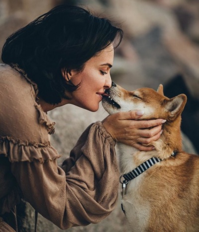 Певица позирует в летящем платье с женихом Артемом Кимом, а также их собачкой породы сиба-ину.