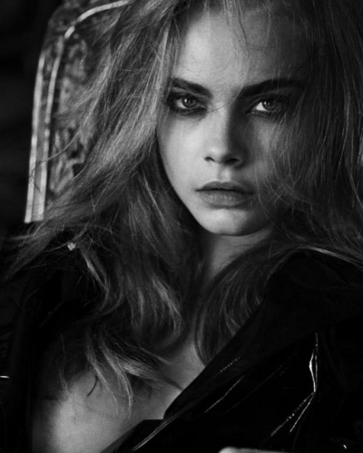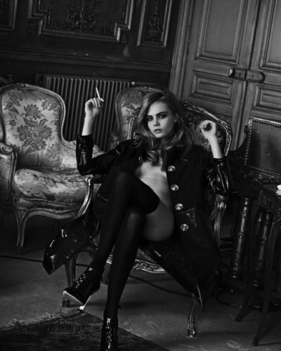 Кара Делевинь снялась для камер фотографов Питера Линдберга и Фабьена Барона. В их объективах Кара позирует совсем без белья. На черно-белых кадрах Делевинь предстала в верхней одежде, под которой нет ничего, кроме чулок.