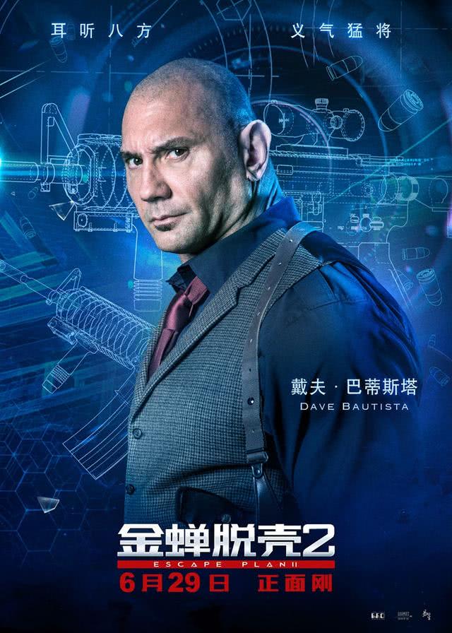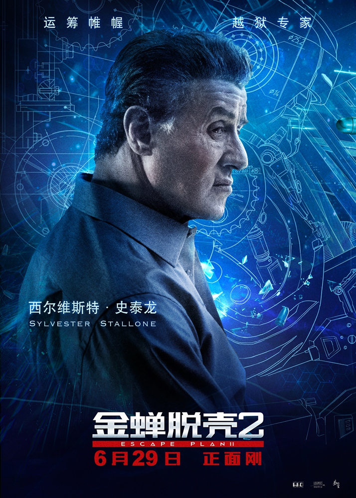 Несколько персонажных постеров боевика «План побега 2» с участием Сильвестра Сталлоне, Дэйва Батисты и Хуана Сяомина. Также в составе экшен-ленты значатся Джесси Меткалф, Кёртис «50 Cent» Джексон, Уэс Чэтэм и Джейми Кинг.