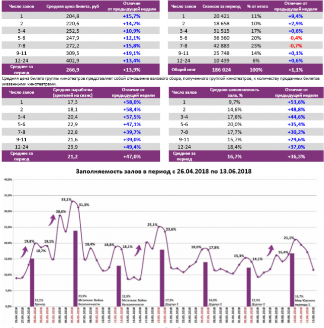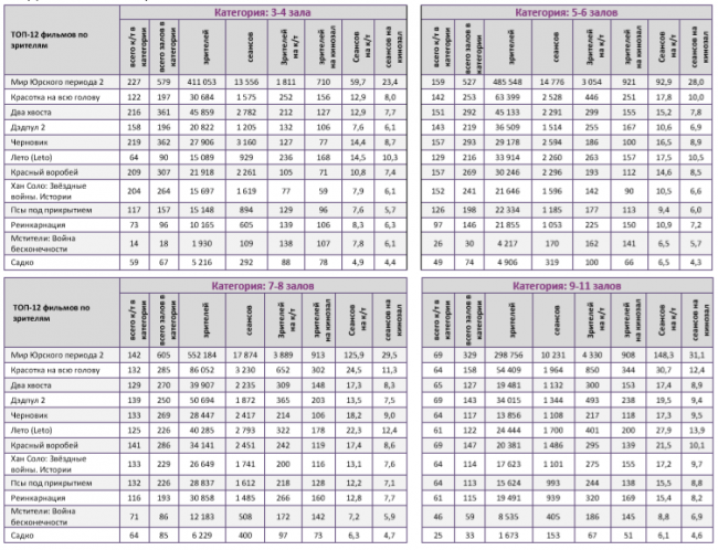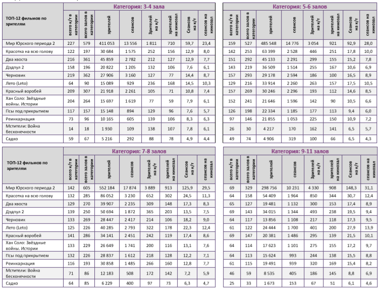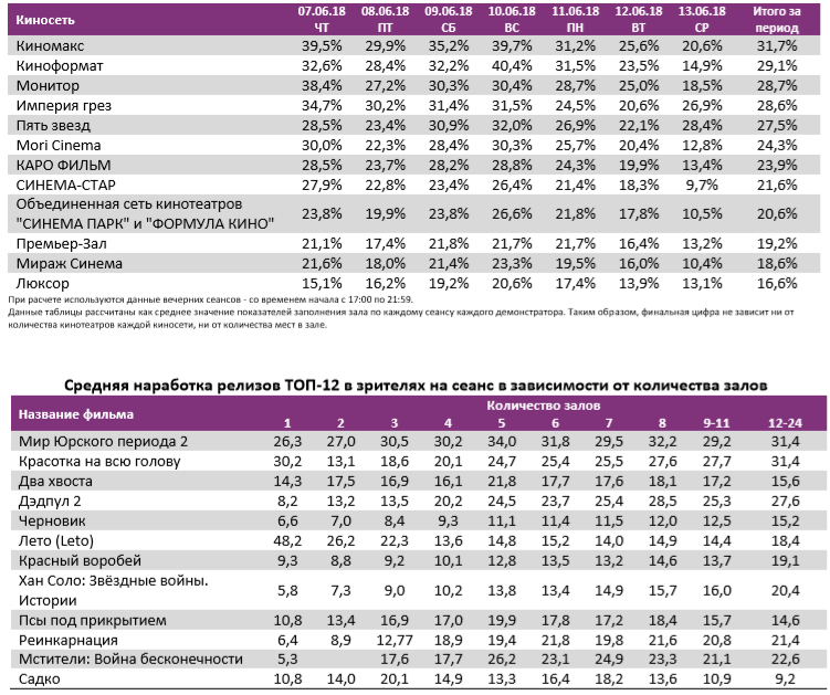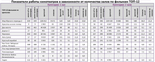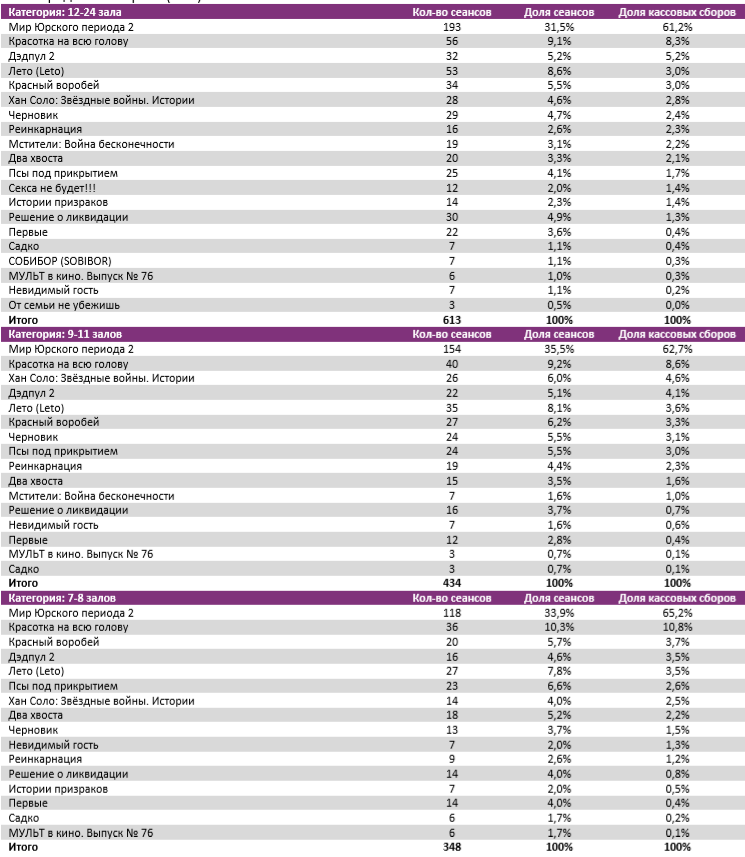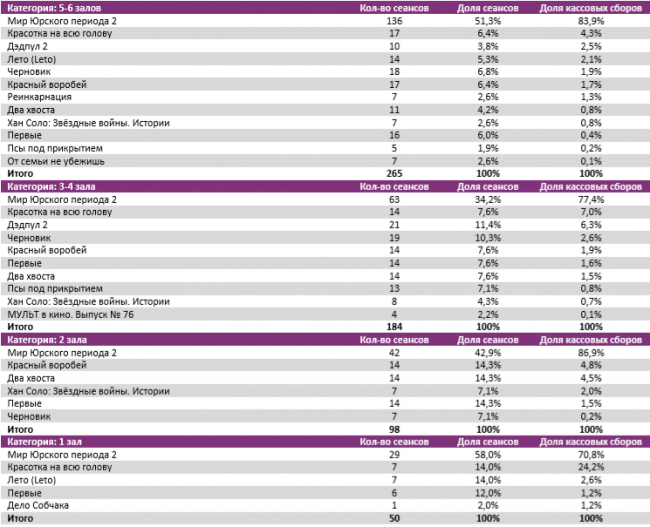 Репертуарное планирование кинотеатров с наибольшей выручкой за период В лучших кинотеатрах страны «Мир Юрского периода 2» показал долю сборов от 61% до 87%, то есть выше средней по стране (59%).