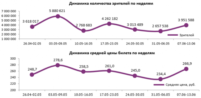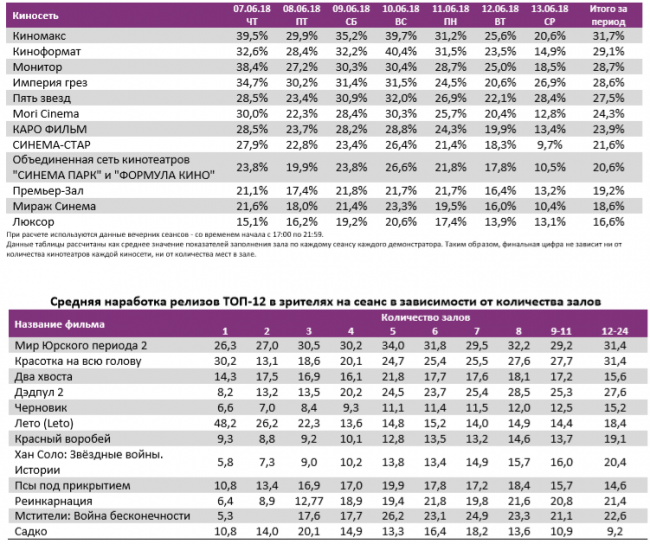 Как показывает индустриальная статистика с 7 по 13 июня (неделя №23), благодаря выходу «Мира Юрского периода 2» посещаемость российских кинотеатров возросла до 4 млн зрителей. На долю новинки пришлось 59% проданных билетов при доле сеансов в 41%. За стартовую праздничную неделю «Мир Юрского периода 2» посмотрело 2,43 млн зрителей. Анимационные российские фильмы «Два хвоста» и «Садко» после двух и трех недель проката заработали 99 млн и 66 млн рублей соответственно. «Лето» Кирилла Серебренникова за семь дней проката посмотрело 144 тыс. зрителей.