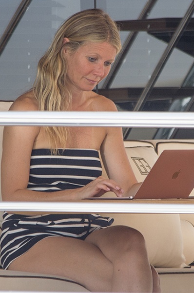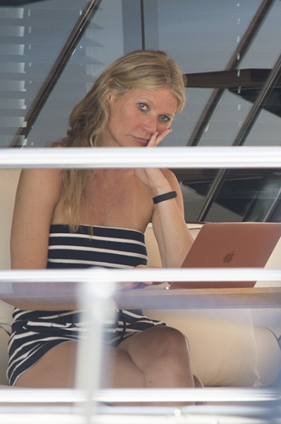 Для отдыха на роскошной яхте Гвинет выбрала самый демократичный образ: звезда фильма "Железный человек" облачилась в короткий черно-белый полосатый комбинезон с открытыми плечами. От макияжа под жарким итальянским солнцем актриса отказалась, продемонстрировав свою естественную красоту. Гвинет уже успела и позагорать — на некоторых снимках отчетливо видны следы от купальника.