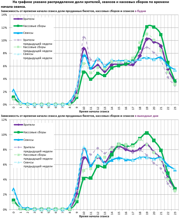 Статистика Фонда кино отражает информацию об основных результатах проката, лидерах недели по сборам и наработке на сеанс, показателях работы кинотеатров, эффективности репертуарного планирования, а также о соотношении долей по сборам, зрителям и сеансам в рамках данного периода.