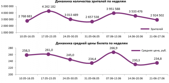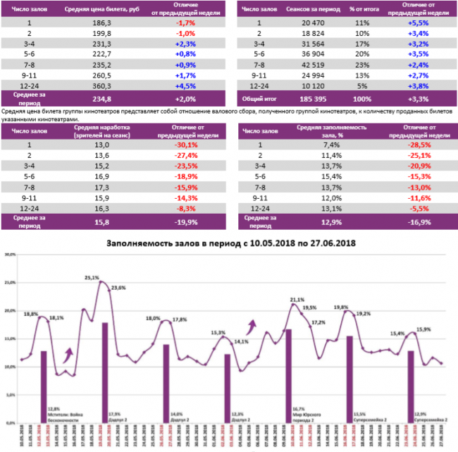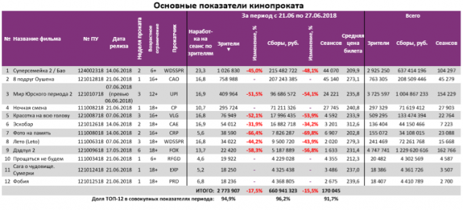 Как показывает индустриальная статистика с 21 по 27 июня (неделя №25), посещаемость российских кинотеатров снижается третью неделю подряд, что объясняется как репертуаром, так и вниманием россиян к чемпионату мира по футболу. «Суперсемейка 2» сохранила лидерство в прокате, потеряв меньше половины проданных билетов и кассовых сборов. В топ-12 по наработке на сеанс по-прежнему фильм «Тренер». За прошедшую неделю каждый сеанс посещало в среднем 16 зрителей.