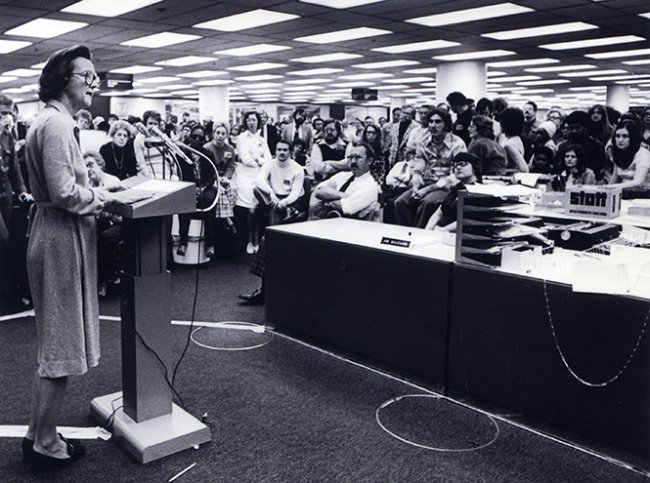 Кэтрин произносит речь перед редакцией, 1975 годВ фильме Спилберга очень хорошо описывается состояние миссис Грэм как женщины, оказавшейся на мужской территории. Они с Филиппом были вхожи во многие знатные дома столицы, в том числе и те, что принадлежали политической элите. Они дружили со всеми ключевыми министрами, неплохо контактировали с Рокфеллерами и Кеннеди, но Кэтрин всегда оставалась просто хорошей матерью и женой успешного человека, который, к слову, вполне мог ей изменить.