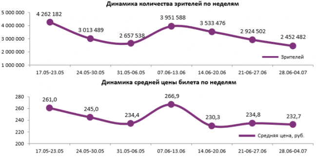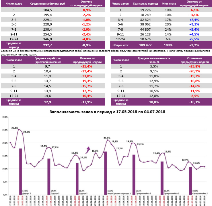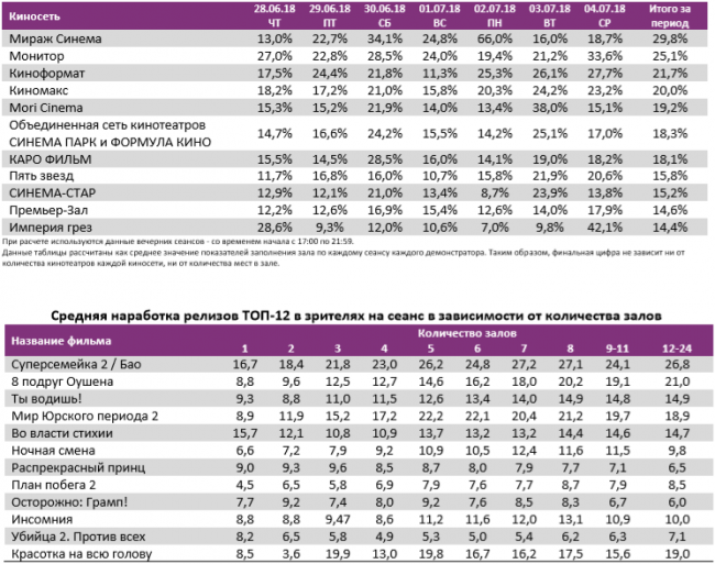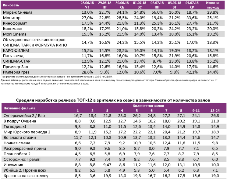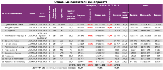 Как показывает индустриальная статистика с 28 июня по 4 июля (неделя №26), посещаемость российских кинотеатров снижается четвертую неделю подряд и достигла минимума за год – 2,45 млн зрителей. «Суперсемейка 2» сохраняет лидерство в прокате третью неделю, потеряв меньше половины проданных билетов и кассовых сборов. Всего на счету мультфильма уже больше 750 млн рублей. Рубеж в 1 млрд рублей преодолел «Мир Юрского периода 2». В топ-12 попало сразу 7 новинок, но ни одна из них не привлекала больше 14 зрителей на сеанс.