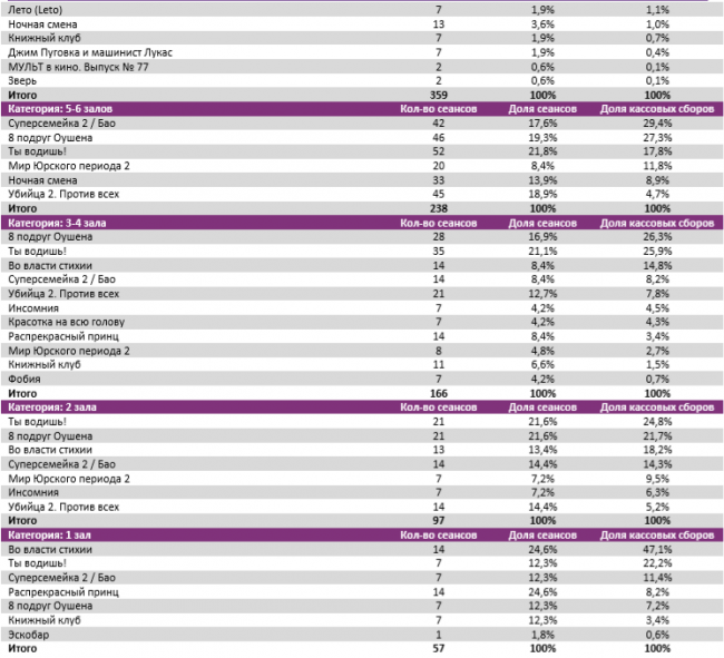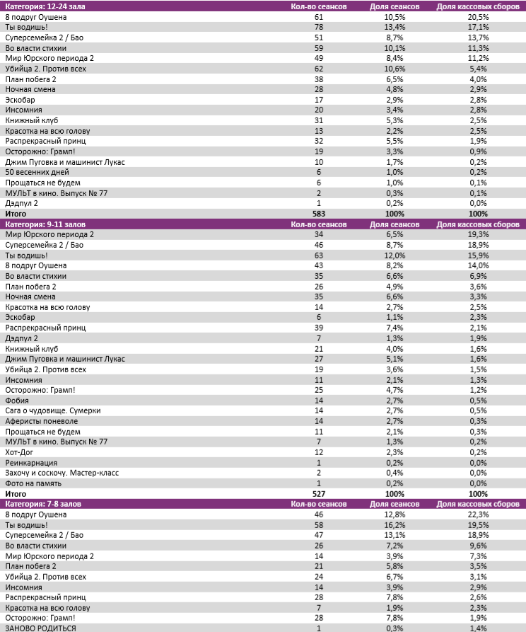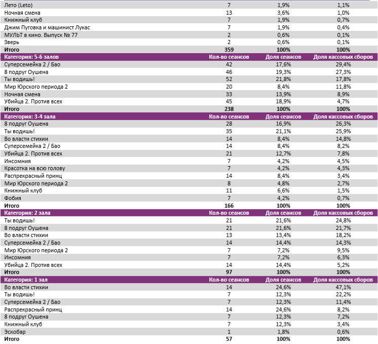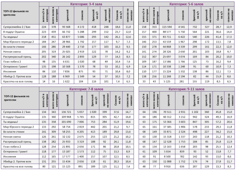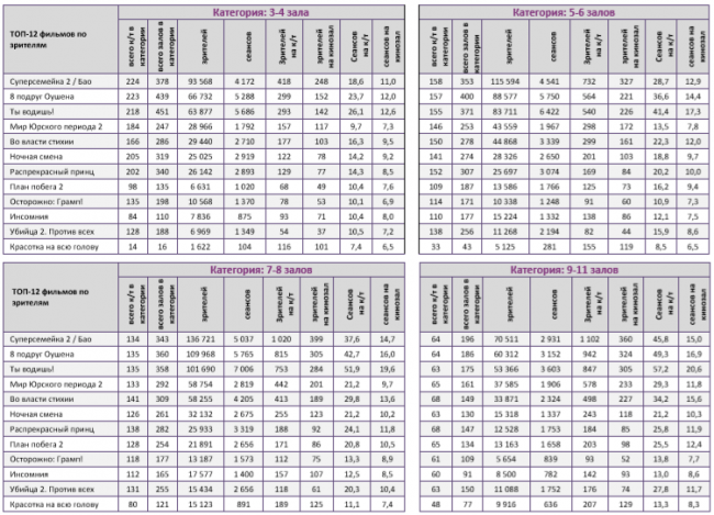 В многозальниках 12+ экранов больше 15 зрителей на сеанс привлекают только 4 проекта: «Суперсемейка 2», «8 подруг Оушена», «Мир Юрского периода 2» и «Красотка на всю голову».