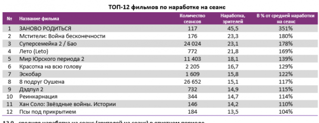 В топ-12 по наработке на сеанс фильмы, идущие в прокате не первую неделю. Стоит отметить высокую наработку на сеанс экспериментального проекта «Заново родиться» с Александром Петровым.