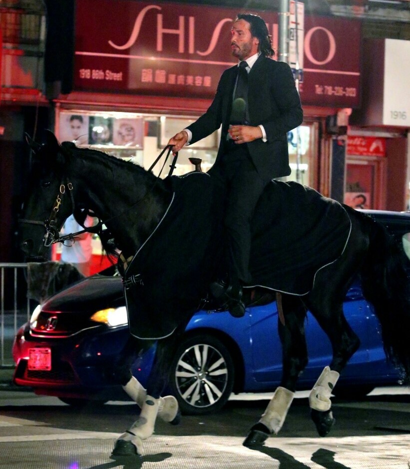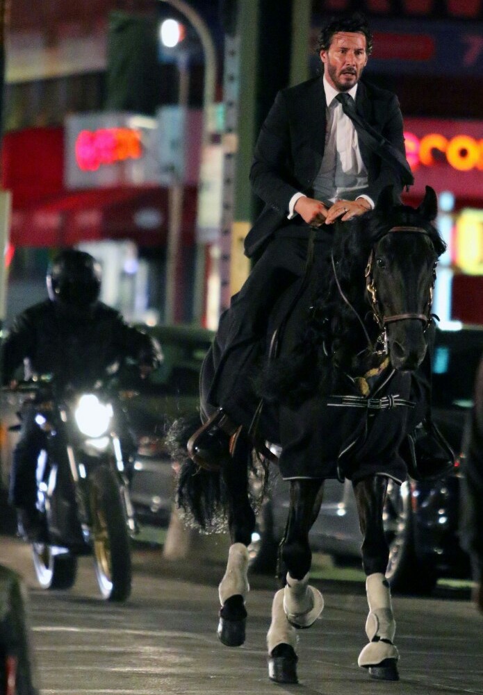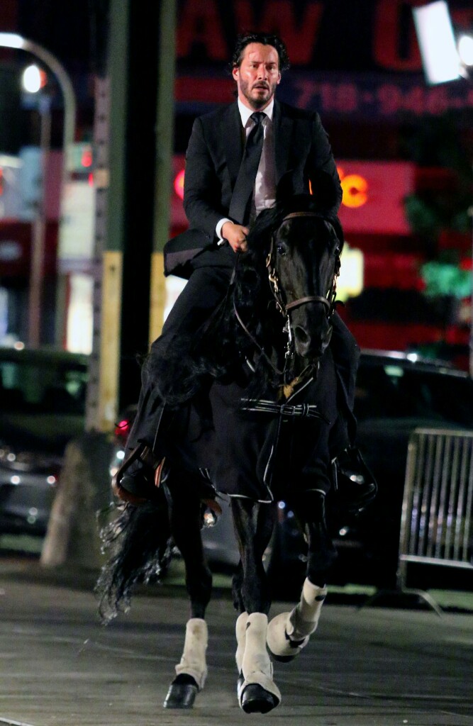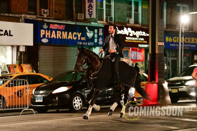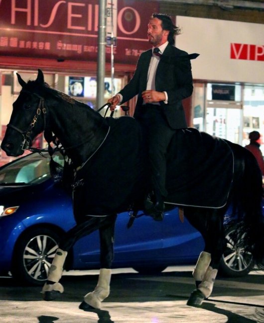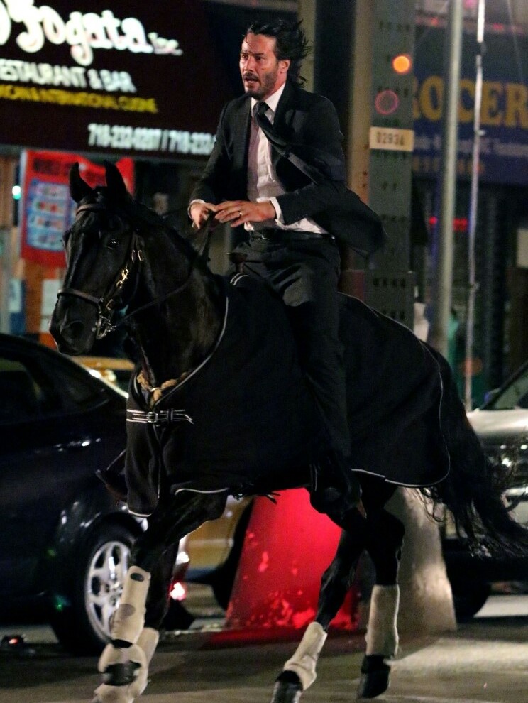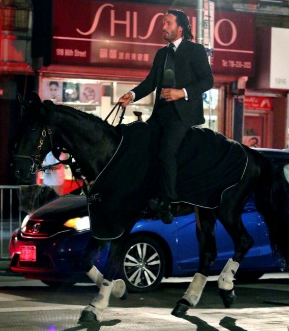 Порция фото и видео со съёмочной площадки боевика «Джон Уик 3: Парабеллум» с Киану Ривзом, рассекающим на бравом скакуне по улицам Нью-Йорка. Премьера третьего фильма о приключениях принципиального киллера намечена на 17 мая 2019 года.