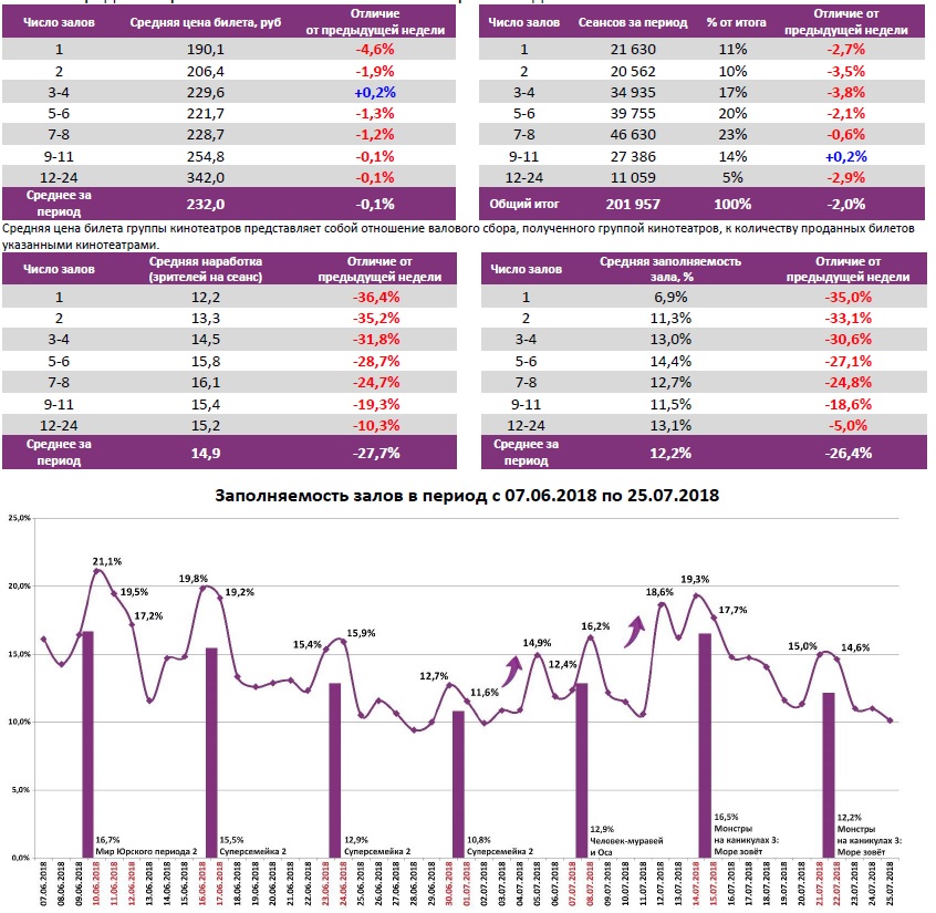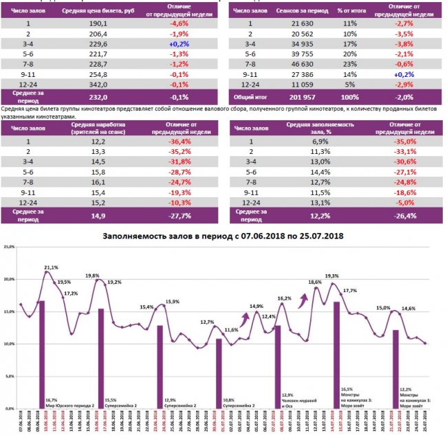 Как показывает индустриальная статистика с 19 по 25 июля (неделя №29), посещаемость кинотеатров вернулась к уровню позапрошлой недели – 3 млн посещений. Лидером проката по-прежнему остаются «Монстры на каникулах 3», потерявшие менее 43% стартового бокс-офиса и увеличившие общие сборы до 733 млн рублей. Среди пяти новинок лучший результат по посещаемости у российской комедии «Килиманджара», по сборам – у «Клуба миллиардеров». Фильм Кирилла Серебренникова «Лето» по наработке на сеанс поднялся со второго места на прошлой неделе на первое. Также в топ-12 российская комедия «Ночная смена». Средняя наработка на сеанс снизилась с 20 зрителей до 15. Средняя заполняемость залов в выходные дни не превышала показатель в 15%. Репертуарное планирование кинотеатров с наибольшей выручкой за период «Монстры на каникулах 3» и на второй неделе остались лидером в 6 из 7 самых успешных кинотеатрах страны. Свыше 300 однозальных кинотеатров показывали на этой неделе российский хоррор «Русалка. Озеро мертвых» и комедию «Килиманджара». Заполняемость кинозалов крупнейших киносетей на сеансах фильма-лидера недели Фильм-лидер недели: «Монстры на каникулах 3: Море зовёт». Лидером среди киносетей на фильме-лидере снова стала «Монитор». Независимые новинки «Офисный беспредел» и «Зои» привлекали на сеанс в среднем меньше 9 зрителей. Статистика Фонда кино отражает информацию об основных результатах проката, лидерах недели по сборам и наработке на сеанс, показателях работы кинотеатров, эффективности репертуарного планирования, а также о соотношении долей по сборам, зрителям и сеансам в рамках данного периода. Подписывайтесь на наш Телеграм-канал