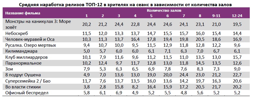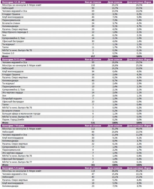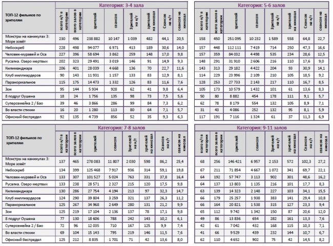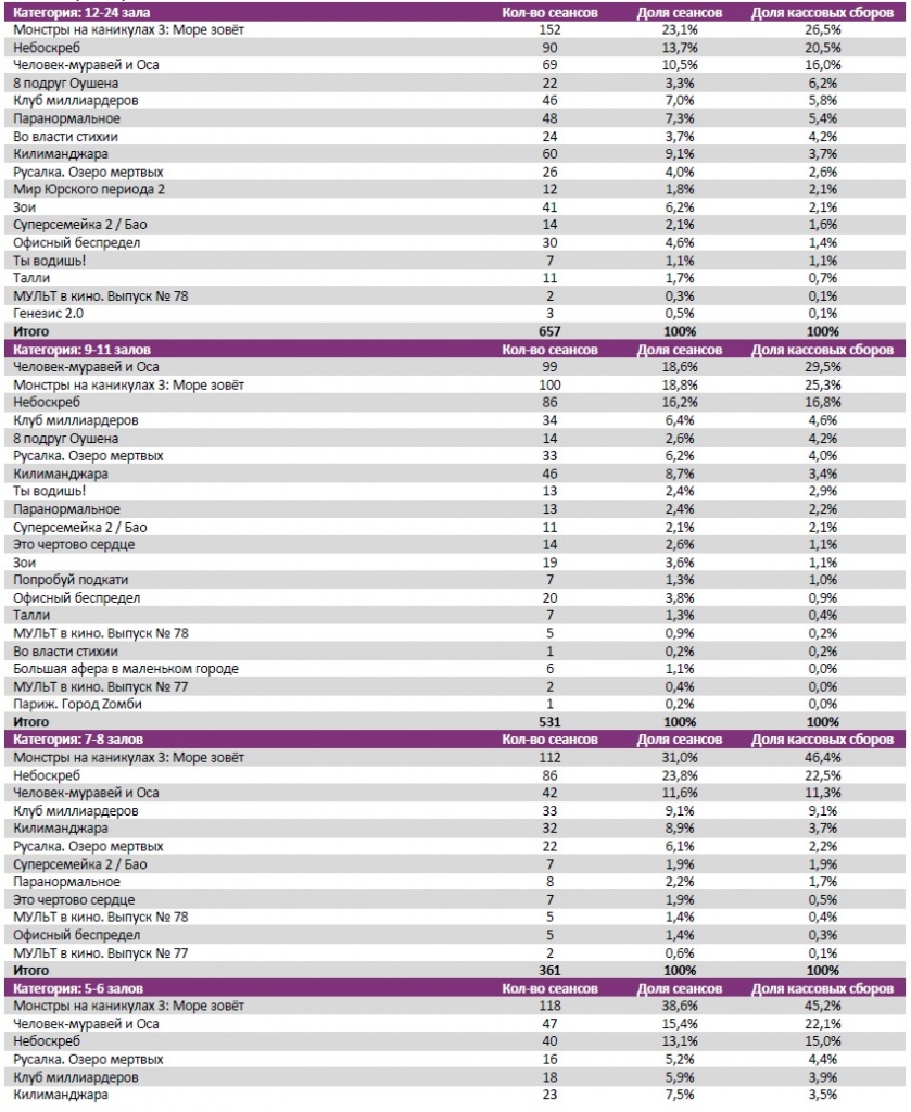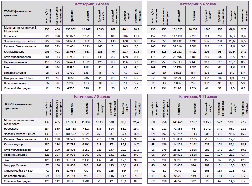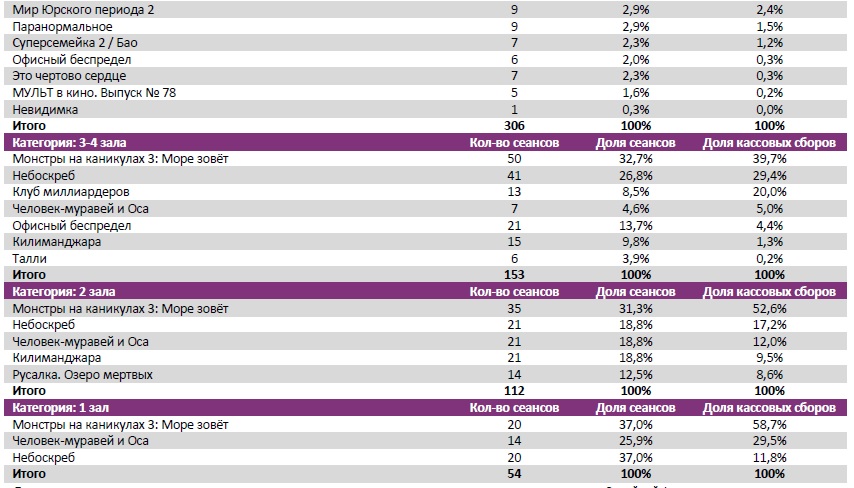 Репертуарное планирование кинотеатров с наибольшей выручкой за период «Монстры на каникулах 3» и на второй неделе остались лидером в 6 из 7 самых успешных кинотеатрах страны.