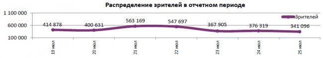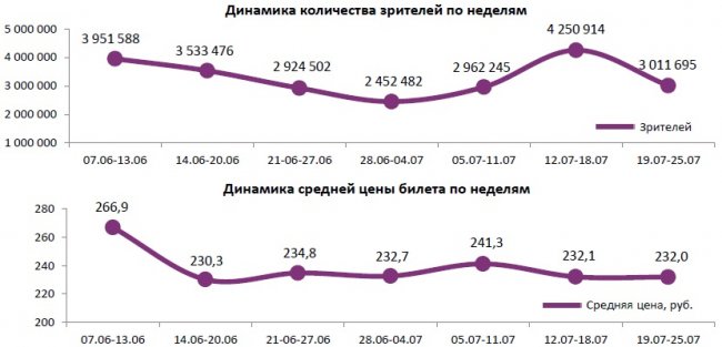 Как показывает индустриальная статистика с 19 по 25 июля (неделя №29), посещаемость кинотеатров вернулась к уровню позапрошлой недели – 3 млн посещений. Лидером проката по-прежнему остаются «Монстры на каникулах 3», потерявшие менее 43% стартового бокс-офиса и увеличившие общие сборы до 733 млн рублей. Среди пяти новинок лучший результат по посещаемости у российской комедии «Килиманджара», по сборам – у «Клуба миллиардеров».