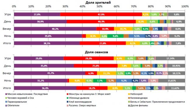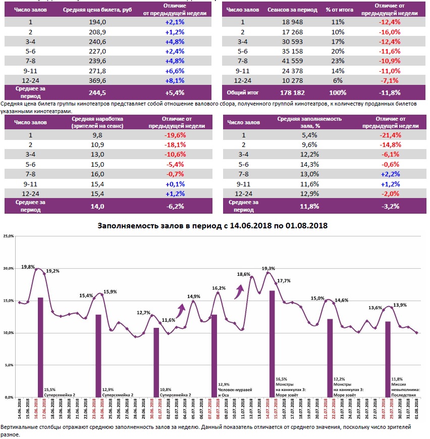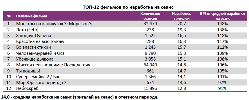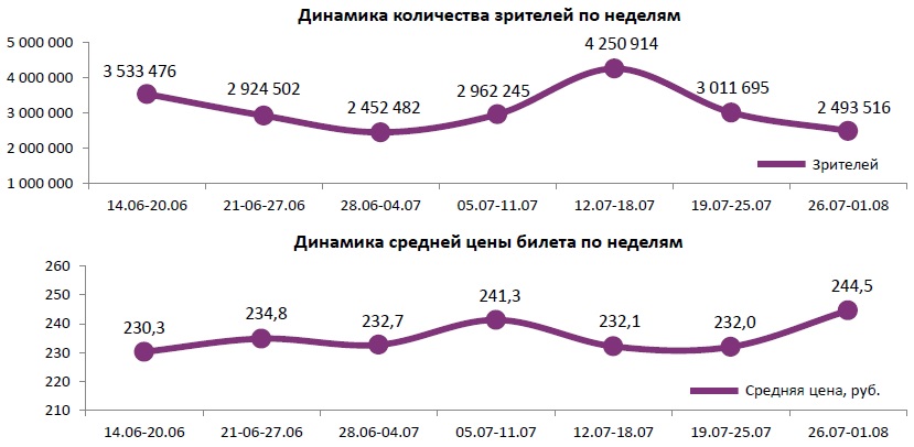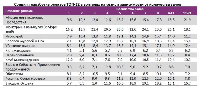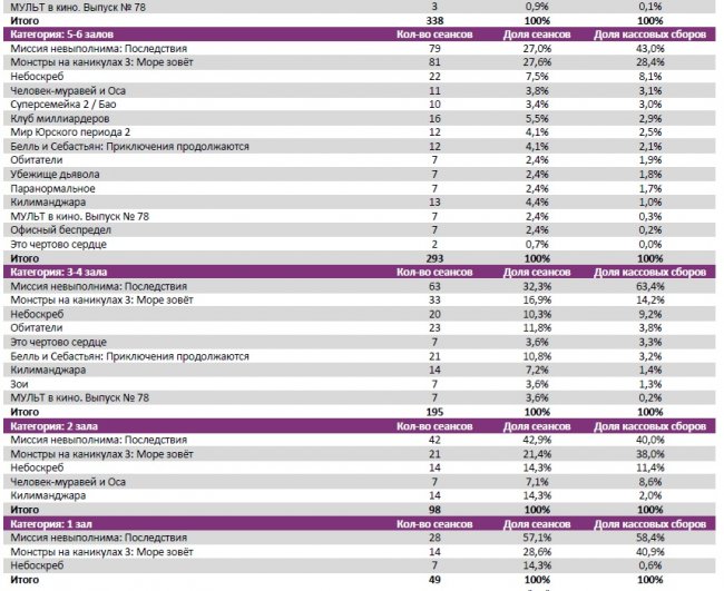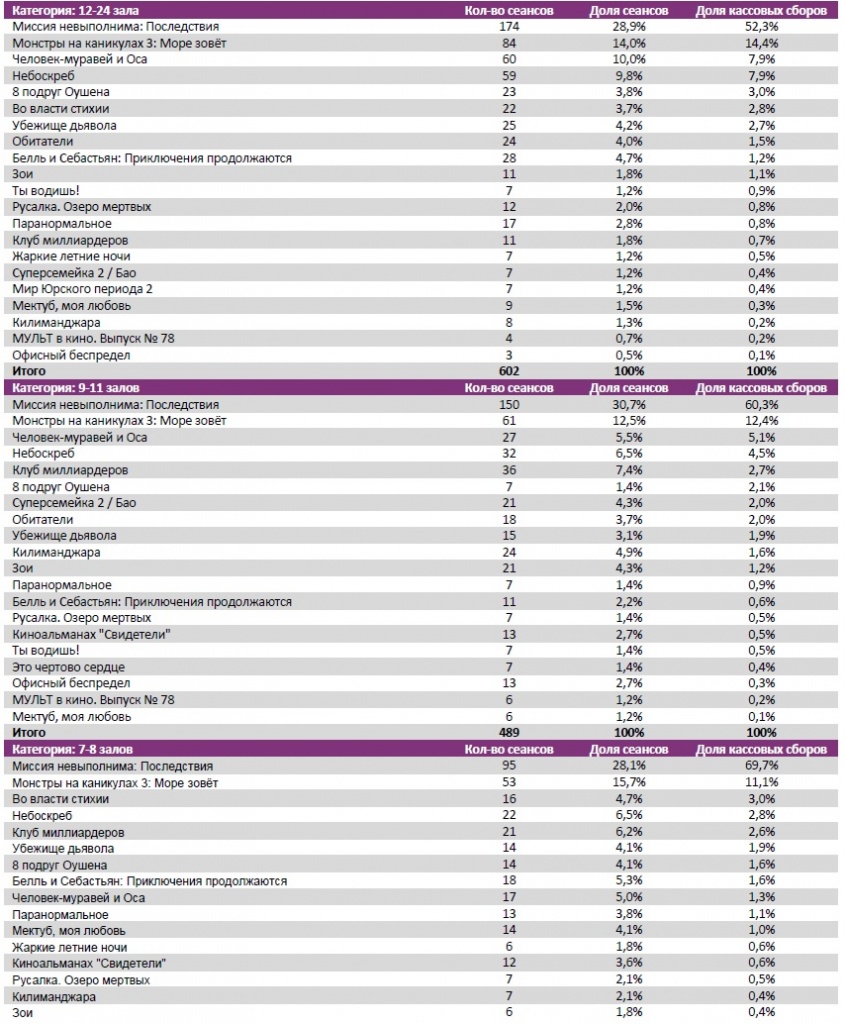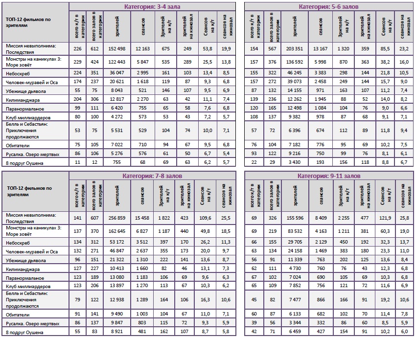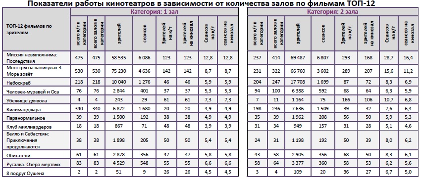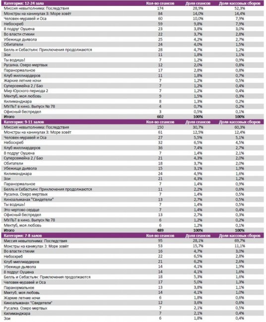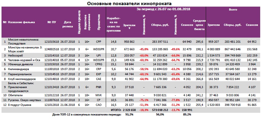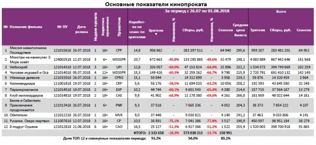 Как показывает индустриальная статистика с 26 июля по 1 августа (неделя №30), посещаемость кинотеатров снизилась до 2,5 млн зрителей, что соответствует периоду на стыке июня и июля, когда на экраны не вышло ни одной крупной новинки. В этот раз все же стартовал большой проект – фильм «Миссия невыполнима: Последствия», на которое пришлось более трети проданных билетов. За первую неделю новый фильм с Томом Крузом посмотрело 960 тыс. зрителей. Рубеж в 1,5 млн проданных билетов преодолели «Небоскреб» и «8 подруг Оушена», а «Монстры на каникулах 3» - отметку в 4 млн посещений.