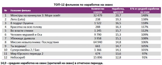 Фильм Кирилла Серебренникова «Лето» по наработке на сеанс продолжает оставаться в топ-3. Также в верхней части чарта два релиза «Вольги» - «Красотка на всю голову» и «Во власти стихии».