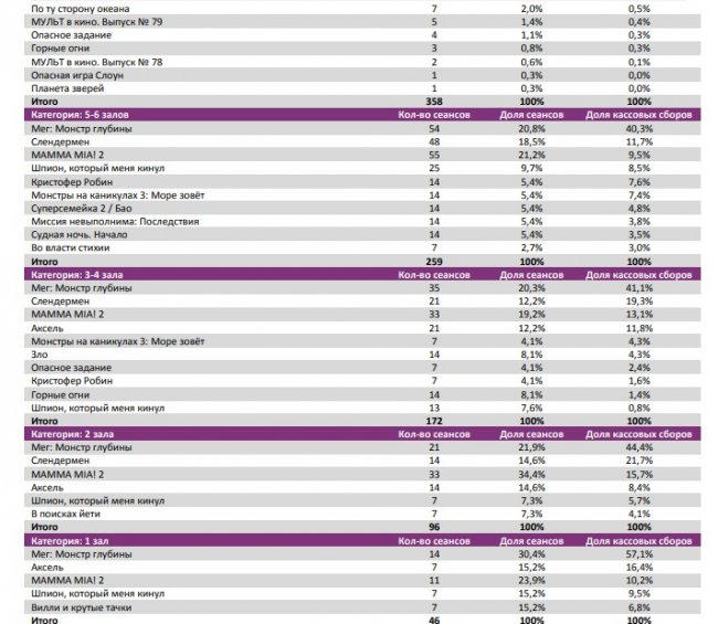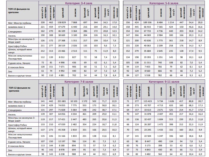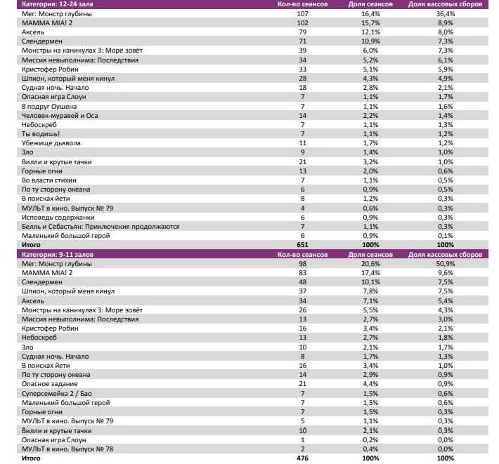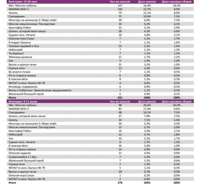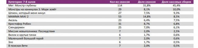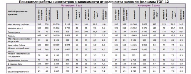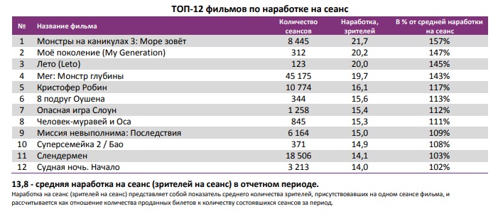 В топ-3 фильмов с лучшей наработкой на сеанс попала документальная лента «Мое поколение». Также стоит отметить высокие показатели блокбастеров начала лета - «Монстры на каникулах 3: море зовет» и «Мег: монстр глубины».