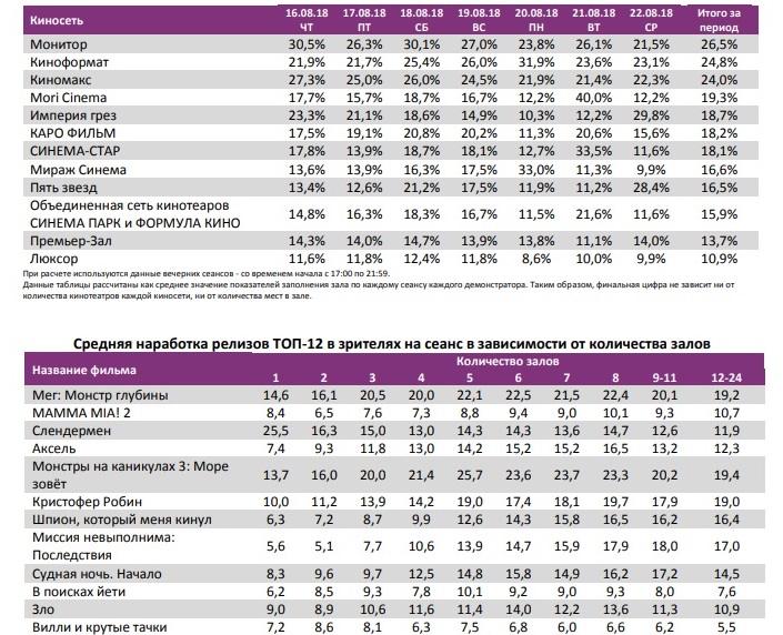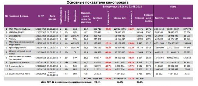 Как показывает индустриальная статистика с 16 по 22 августа (неделя №33), российский прокат пятую неделю подряд не может преодолеть рубеж в 3,5 млн. зрителей. За отчетный период было продано 2,4 млн. билетов. По кассовым сборам лидерство в прокате сохранил фантастический экшен с Джейсоном Стэтхемом «Мег: Монстр глубины» от Каро Премьер, потерявший чуть больше половины стартовой кассы. Мюзикл «Mamma Mia!» от UPI за первую неделю проката привлек в кинотеатры меньше 300 тыс. зрителей, уступив по показателям первой части.
