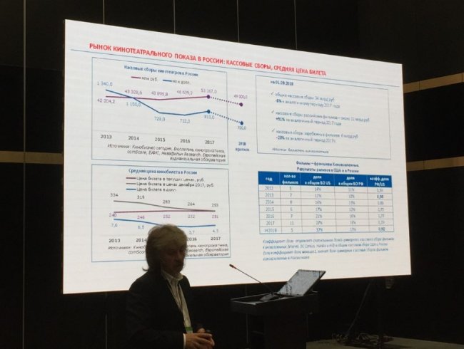 В начале встречи председатель совета Ассоциации владельцев кинотеатров Олег Березин показал зрителям график, из которого видно, что в 2018 году отмечается самый низкий индекс предпринимательских настроений: -37,1. Этот результат ниже, чем в кризисные годы - 2008 и 2014. Исходя из этого, Олег Березин предложил участникам встречи поговорить о трех самых обсуждаемых проблемах в индустрии кинотеатрального показа.