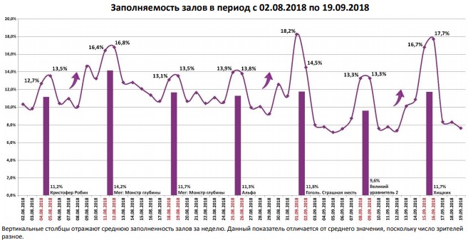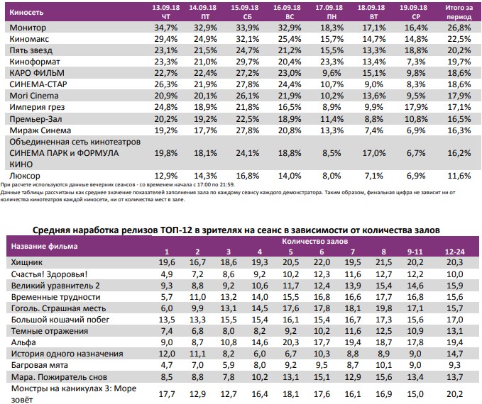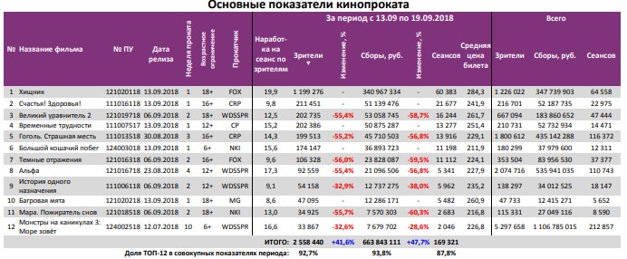 Как показывает индустриальная статистика с 13 по 19 сентября (неделя №37), на третьей неделе сентября посещаемость российских кинотеатров выросла по сравнению с прошлой неделей, но уже пятую неделю подряд в кино приходит меньше 3 млн зрителей. Более 40% пришлось на фильм «Хищник».