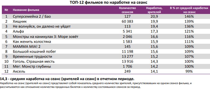 Топ-12 фильмов с лучшей наработкой на сеанс по-прежнему возглавляет мультфильм «Суперсемейка 2», вышедший летом.