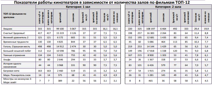 Показатели работы кинотеатров в зависимости от количества залов по фильмам ТОП-12