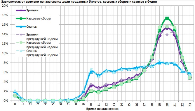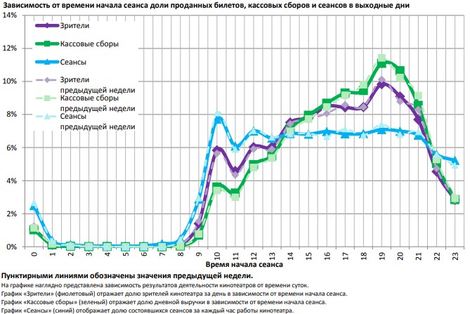 Распределение доли зрителей, сеансов и кассовых сборов по времени начала сеанса