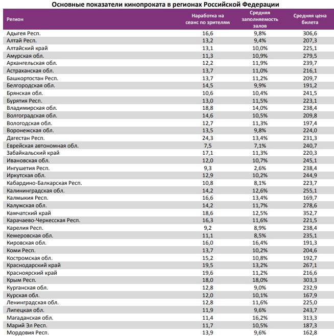 Основные показатели кинопроката в регионах Российской Федерации