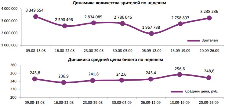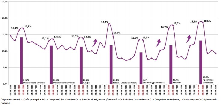 Как показывает индустриальная статистика с 20 по 26 сентября (неделя №38), на последней неделе сентября посещаемость российских кинотеатров оказалась максимальной за последние шесть недель. 45% билетов от общего числа пришлось на долю хоррора «Проклятие монахини».