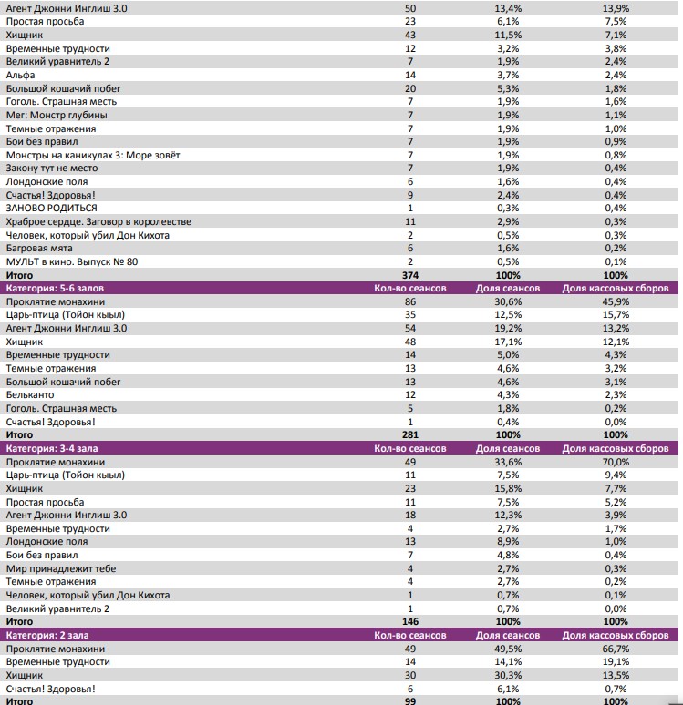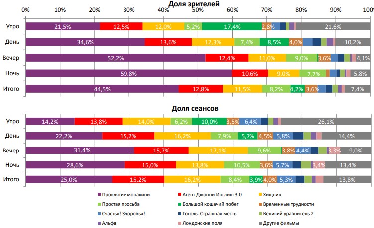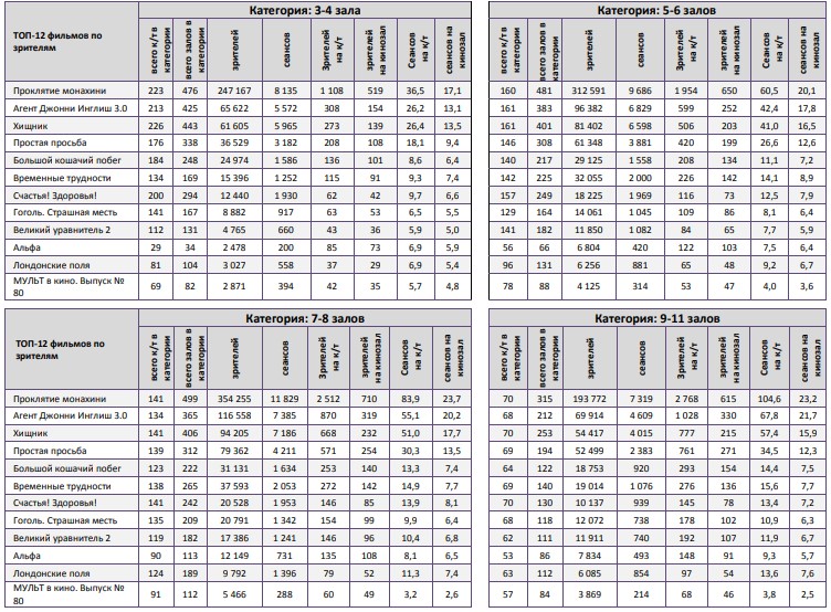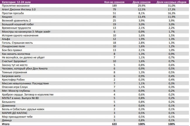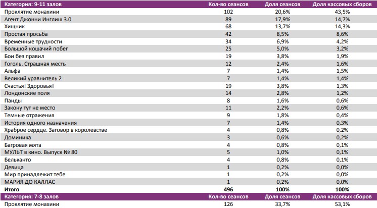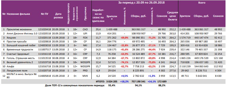 Фильм «Проклятие монахини» привлек в кинотеатры 1,44 млн зрителей на первой неделе. Сразу на 71% снизились сборы «Хищника». В невольной конкуренции «Временных трудностей» и «Счастья! Здоровья!» вперед вырвался первый фильм благодаря лучшей динамике сборов второй недели.